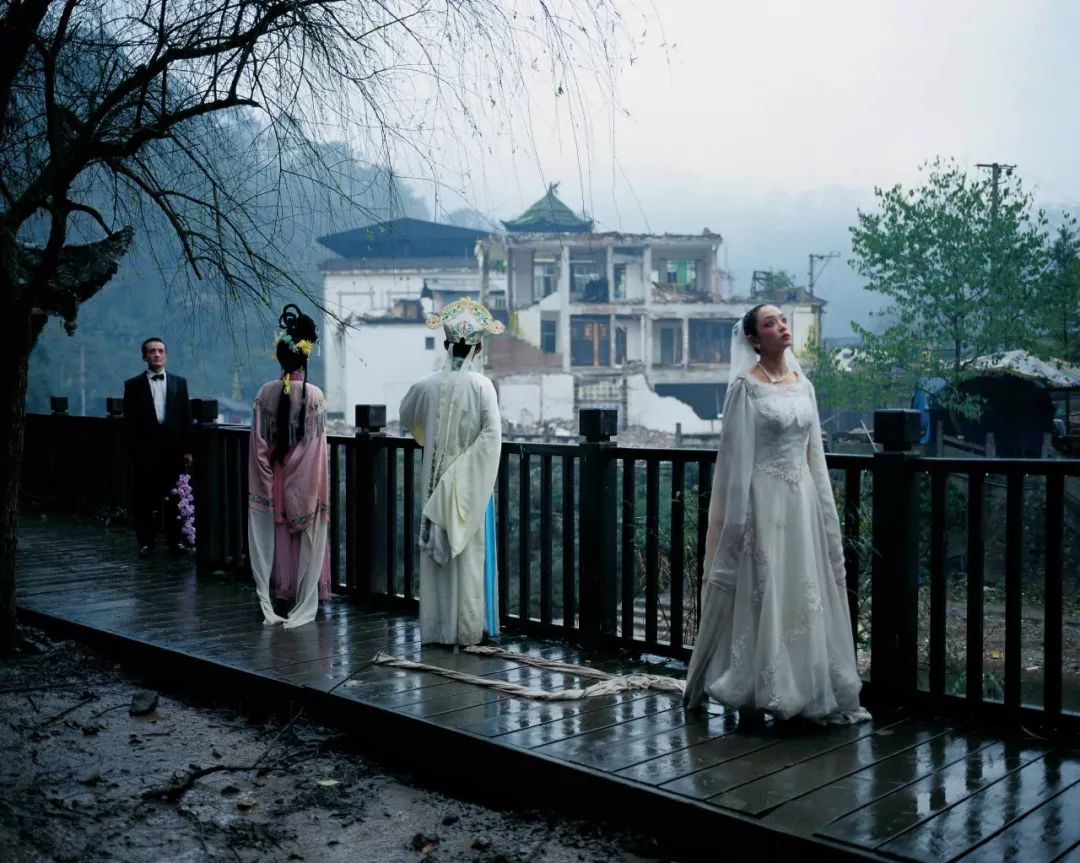 这是我把自己打扮成新娘的样子,在废墟里拍照。代表是一种向生而死吧,有生的希望。