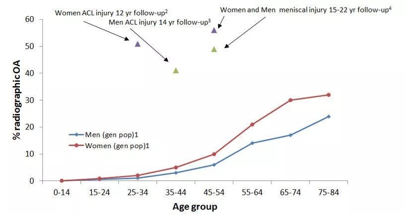 如图所示:圆点图为普通人群OA的影像学阳性率,年纪越大,阳性率越高。三角图为不同损伤发生后在一定年数内的阳性率。后者年龄明显提前,且OA阳性率高。