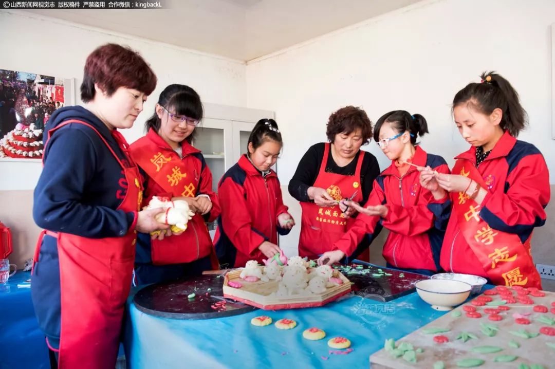 袁建华在精心指导岚城中学的孩子们制作花馍。
