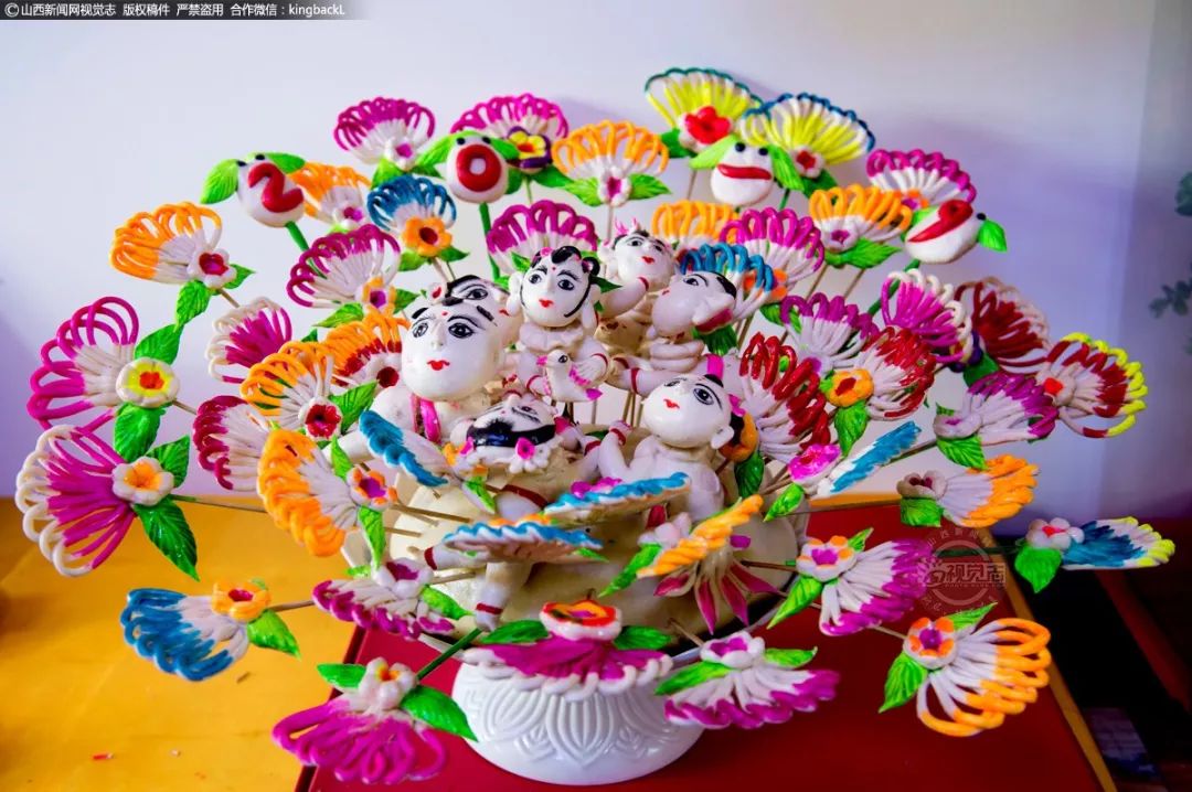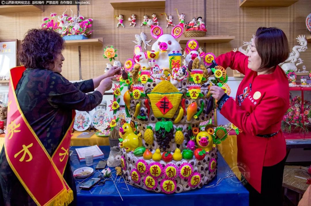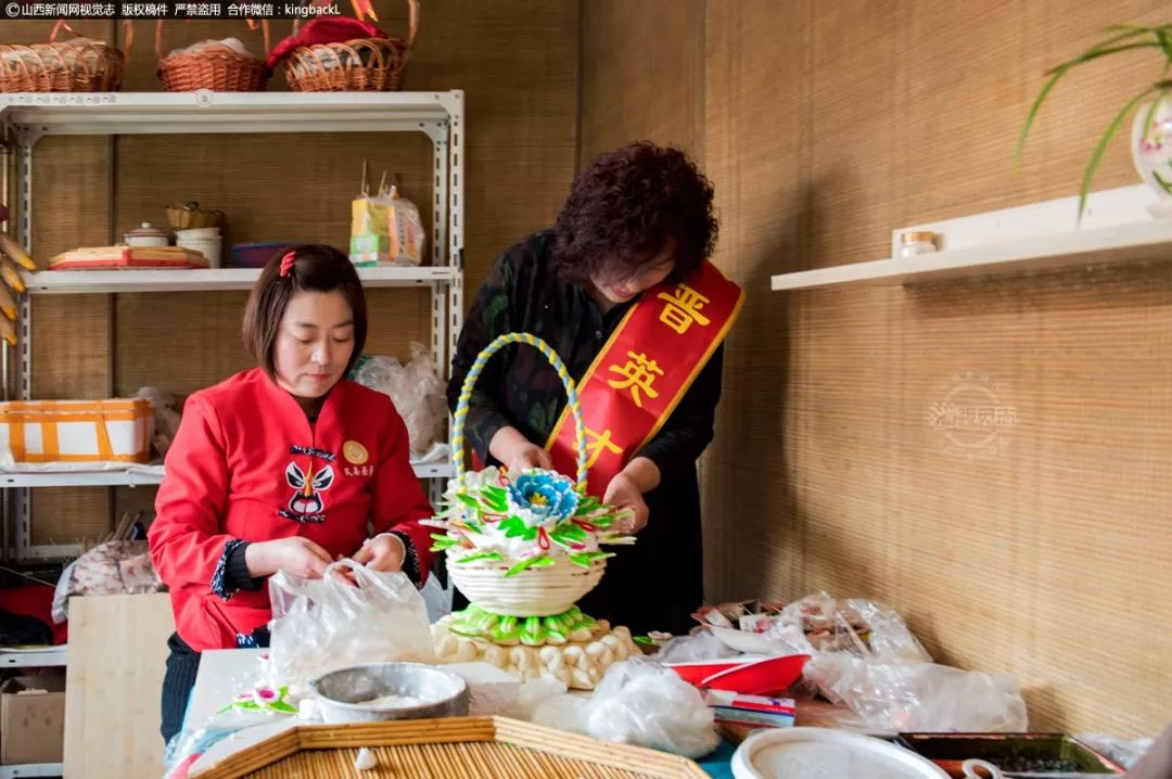 母女俩在展示共同制作的面塑作品。如今,面塑成了袁建华家发家致富的“金钥匙”。她家的面塑作品不仅销售到山西省内的太原、吕梁、忻州等地,还远销到内蒙古、甘肃、河南等省份。袁建华说:“还要将自己的面塑作品推向更大的市场,带出更多的面塑艺术非物质文化遗产传承人。”