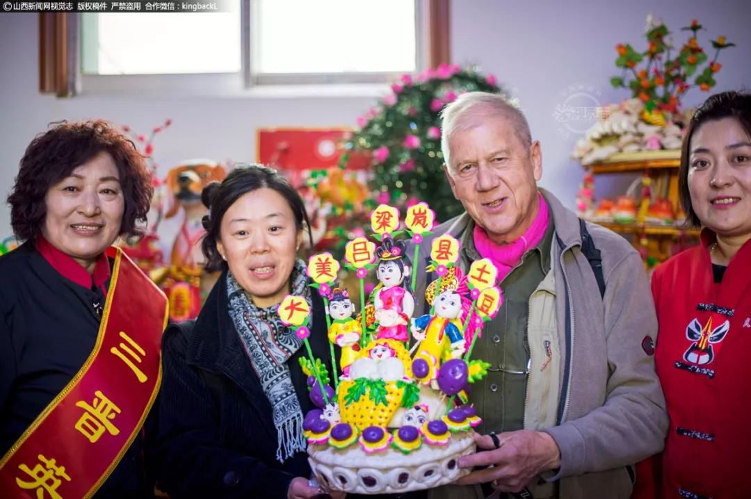 外国友人参观袁建华的面塑作品。