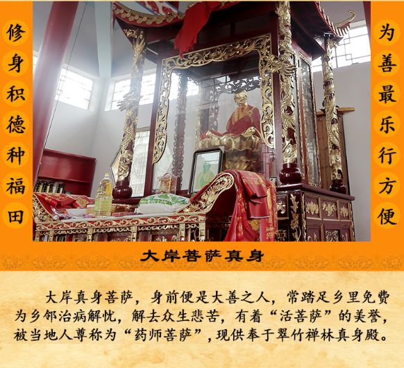 简单而言,肉身菩萨,皆是身前具有大功德之人。而翠竹禅林的这尊大岸菩萨真身身前便是大善之人,常踏足乡里免费为乡邻治病解忧,或开法作坛,解去众生悲苦,有着“活菩萨”的美誉,又被当地人称为“药师菩萨”。