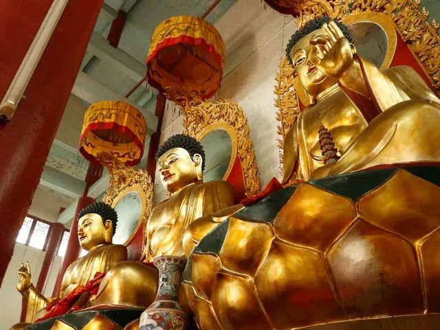 (大雄宝殿内的三尊佛像,已有部分脱金)