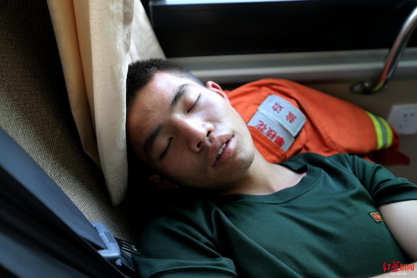 冕宁县森林大火直击去现场扑火的消防员。刚从山上扑火回来的消防员在车上睡觉休整