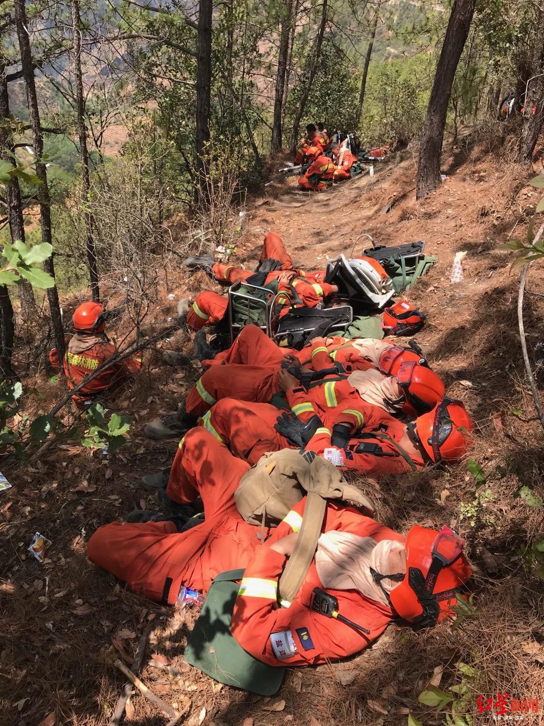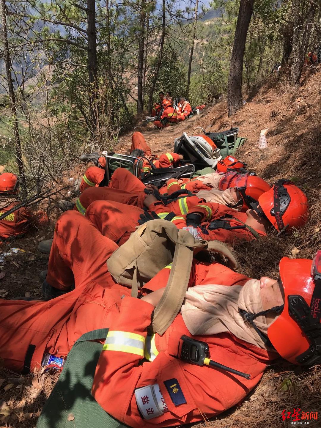 冕宁县森林大火直击去现场扑火的消防员。扑火的消防员在山上休整