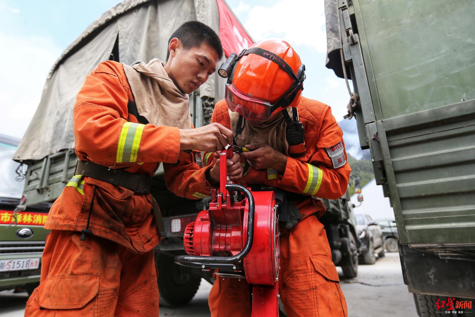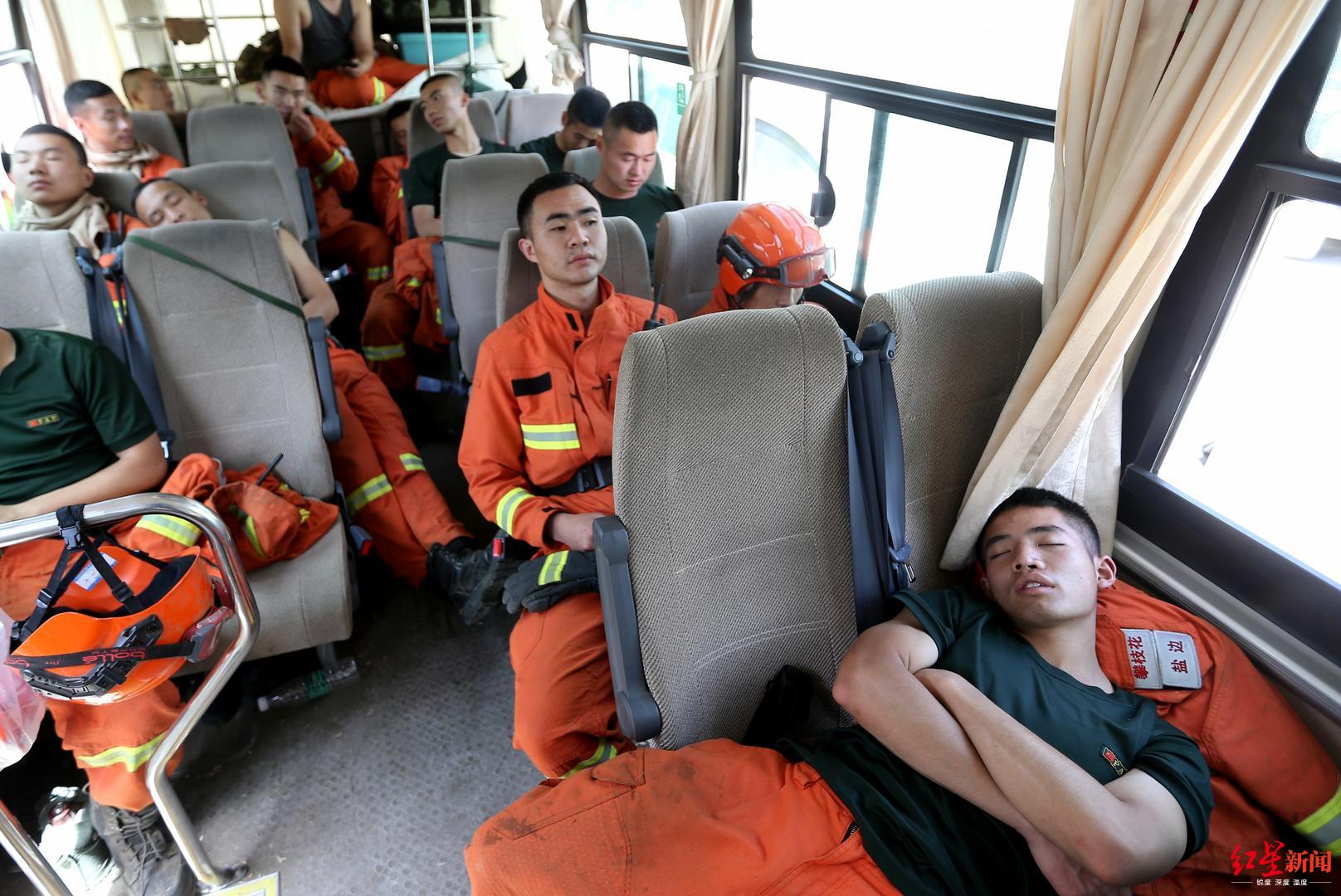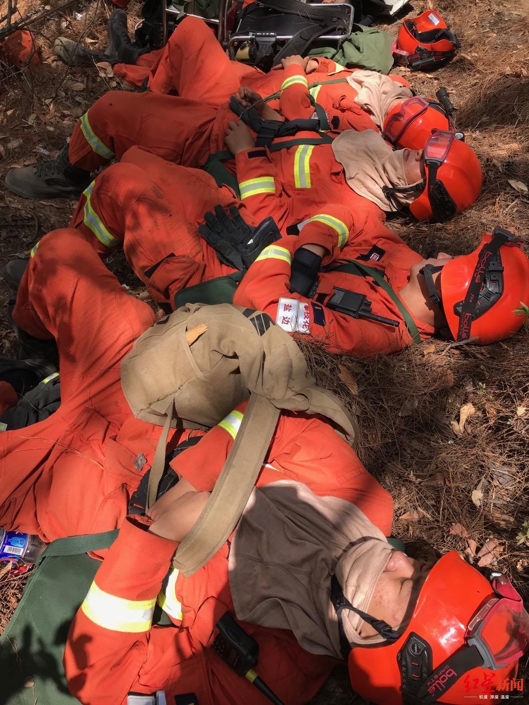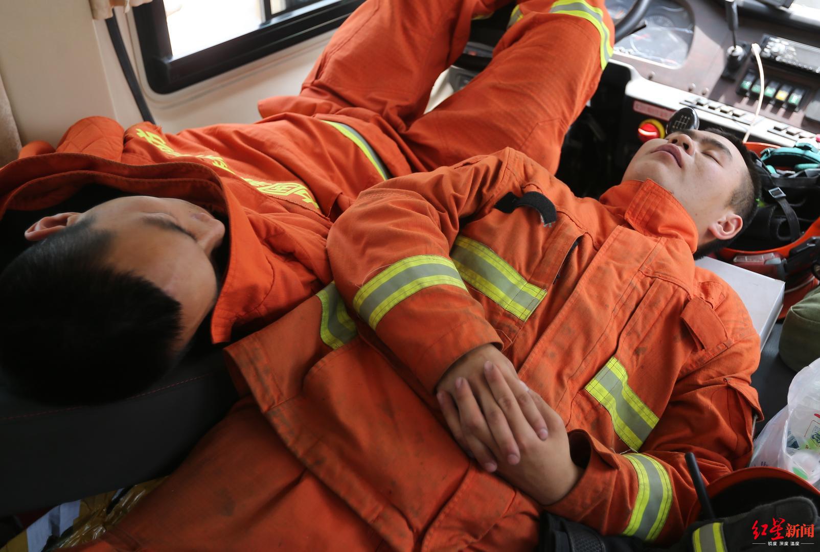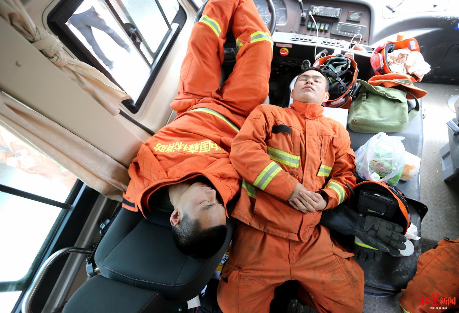 红星新闻记者在现场看到,由于长时间在一线奋战,消防员们已经很疲惫。