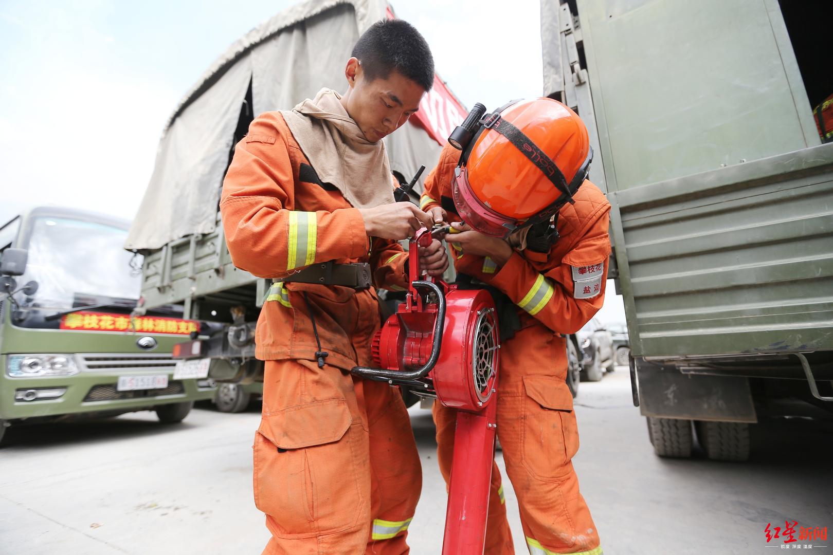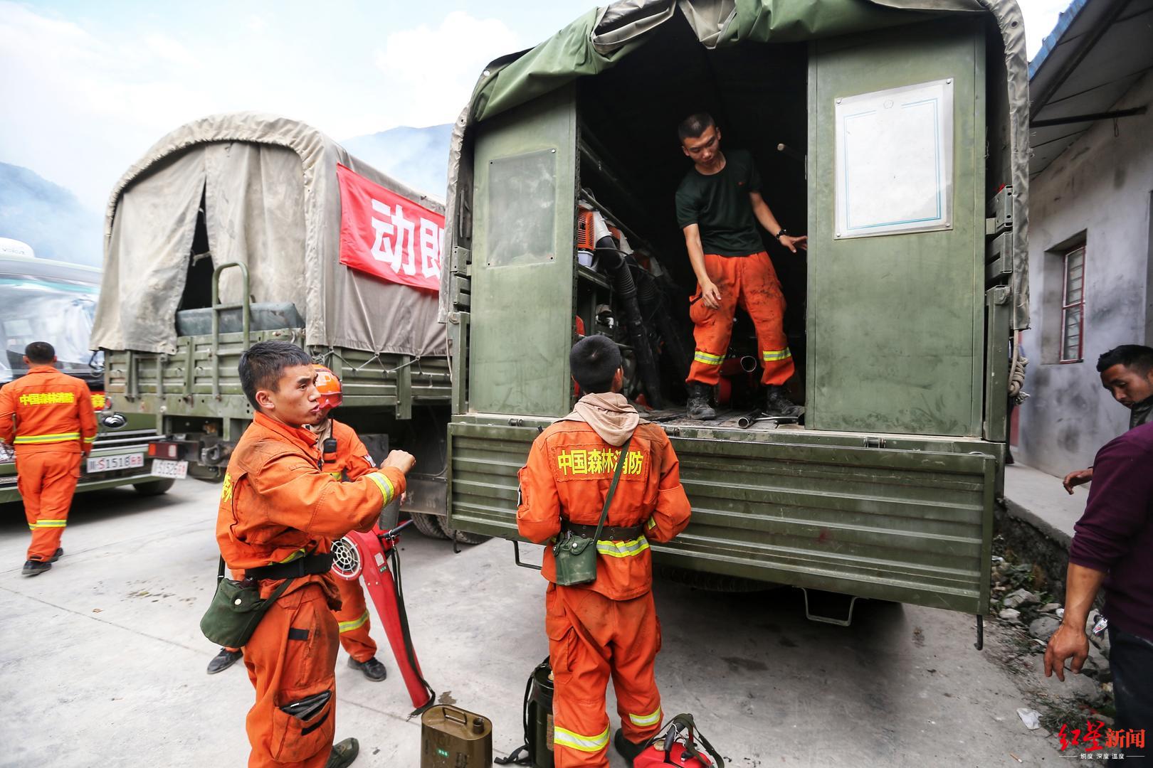 冕宁县森林大火直击去现场扑火的消防员。刚从山上扑火回来休整的消防员在整理扑火用具