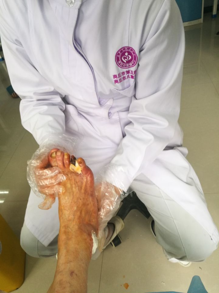 图 我们足病专科医护人员对脚趾发黑的糖尿病患者进行肢体足部的护理,再进行有效的清创、剥离,才能有效控制病情的发展