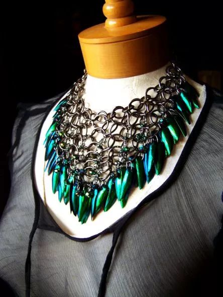 利用玉虫翅膀的镶嵌工艺看似是日本的独门秘技,实则在中国古籍中早有记载。南朝梁文学家吴均写过《和萧洗马子显古意诗六首》,其中第二首诗有一联“莲花衔青雀,宝粟钿金虫”,对仗工整、平仄和谐,并且无意中记录了玉虫镶嵌的古代工艺。此外,提及“金虫”的古籍还有:唐代李贺的《恼公》诗“陂陀梳碧凤,腰袅带金虫”;五代顾夐(xiòng)的《酒泉子》“掩却菱花,收拾翠钿休上面,金虫玉燕,琐香奁”;还有清代赵进美《山花子·晓妆》“双启螭奁交翠羽﹐半欹蝉鬓卸金虫”。宋代宋祁在《益部记》中明确记载:“利州山中有金虫,其体如蜂,绿色,光若泥金,俚人取作妇女钗鐶之饰。”只不过,中国人觉得桃金吉丁虫的光泽不似“玉”,反类“金”,故名之曰“金虫”。