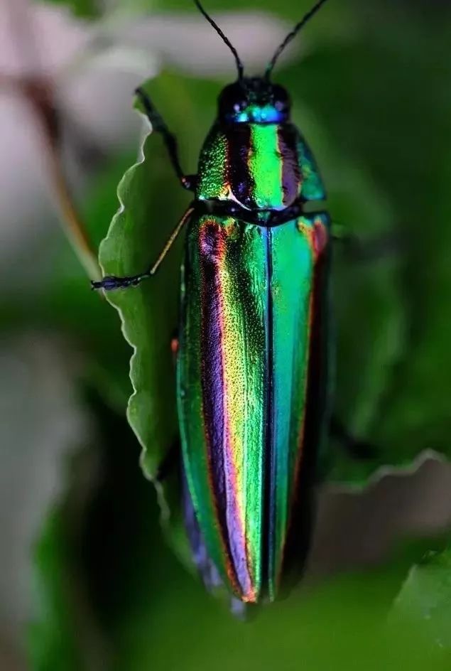 日本人之所以把桃金吉丁虫呼作“玉虫”,也并不完全是因为它的颜色如玉。在日语里,“玉”的发音是tama,和“魂”的发音tamashii相近,故而日本人相信玉虫是灵魂之虫。兼之玉虫死后颜色经久不褪,日本人更加坚信它是灵魂不灭的化身,所以常用玉虫翅膀来装饰宗教法器。