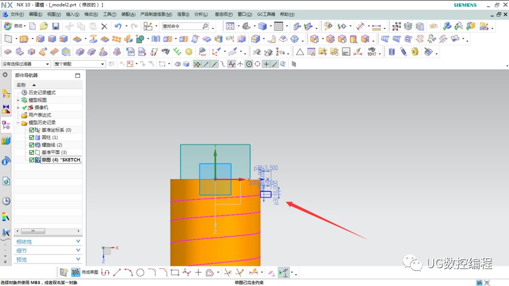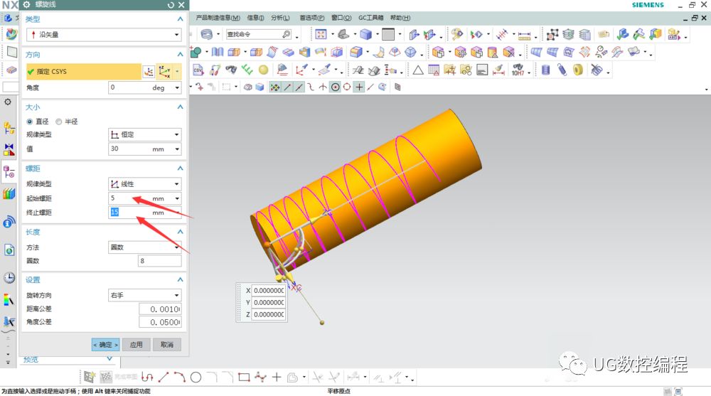 2、选择插入/曲线/螺旋线,螺距选择为线性,输入起始和终止螺距,选择起点偏移10毫米,直径与圆柱体一致。