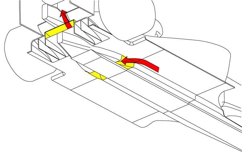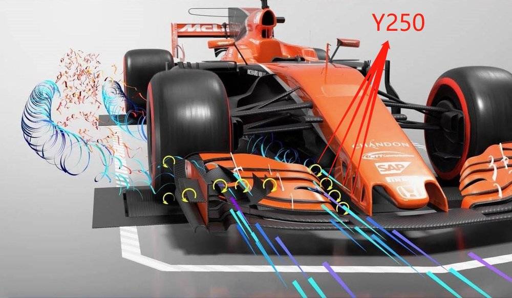 前者最著名的例子,是如今 F1 赛车上最重要的两组涡流 “Y250” 涡。为了减少气流分离导致的失速可能,赛车的前后翼都会采用纵向多片副翼组合。按照 F1 规则,这些副翼不允许出现在赛车中线左右 250mm 范围。而每片副翼内侧(距中线/Y 轴 250mm 处)的翼尖,都会拉出一道流向车底两侧的涡流,这左右两组涡流因此得名 Y250 涡。Y250 涡对于车底和车侧气流有着重要的控制作用,比如它可以帮助封闭车身底部的两侧,避免本应流向车尾扩散器的气流“侧漏”而损失下压力。