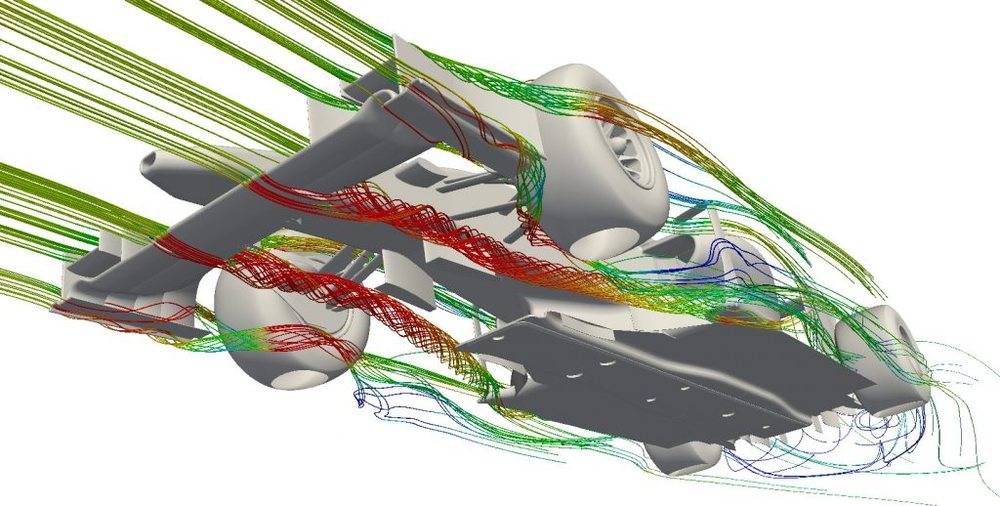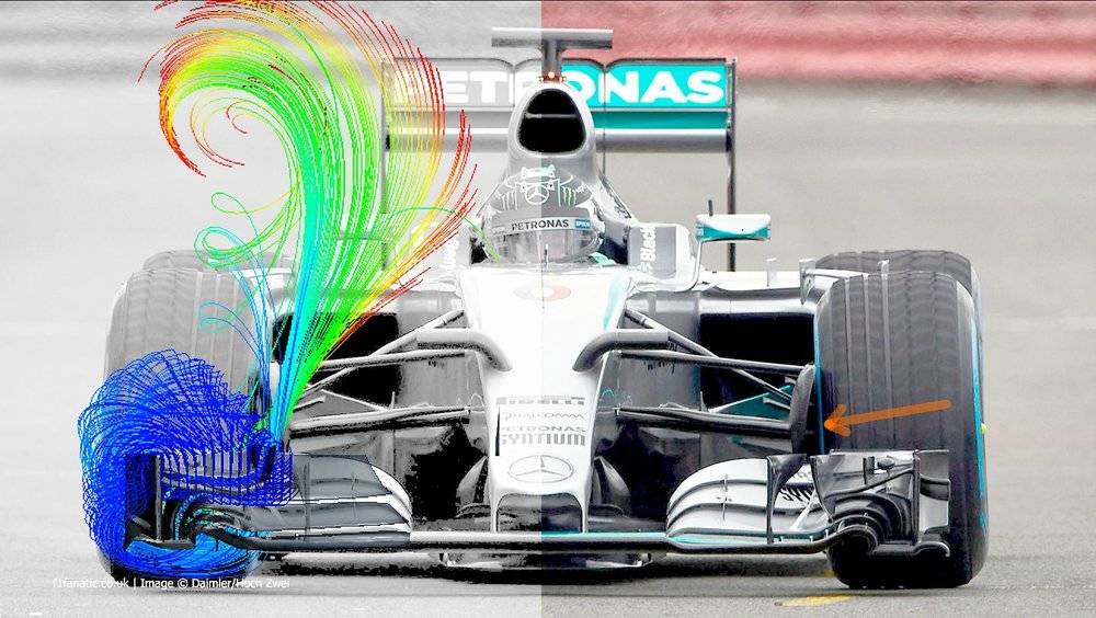 当气流流经车轮这样的部件,或者流至翼片尖端,会形成螺旋形的涡流。对于 F1 来说,涡流既是良药也是砒霜。涡流有行进方向稳定的趋势,不容易受到干扰破坏,这使得设计师可以利用涡流来对其他气流进行控制;但涡流很难被直接利用生成下压力,如果有涡流流经尾翼之类的下压力部件,往往需要对部件做优化设计来避免负面效应。