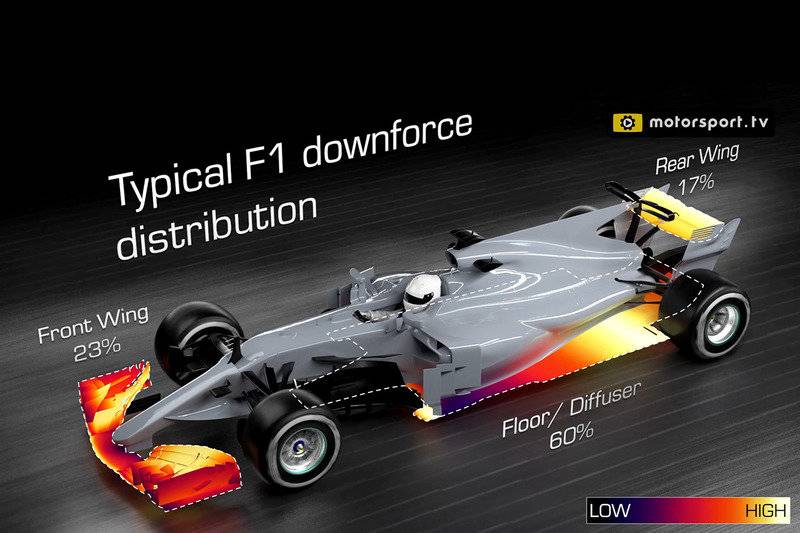 这些下压力中大约有 20-30% 由前翼产生,30-40% 由尾翼产生,50% 左右由车尾扩散器(底板)生成,车身的其他部分也可能提供一些下压力。简单来讲,前后翼的下压力来自于翼片翼型产生的气压差(就是飞机机翼倒置);车尾扩散器则形似一个喇叭,车底气流到达车尾时通道迅速扩大,使得气流加速抽离车底形成负压,从而对赛车产生向下的压力。