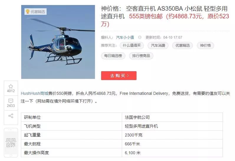 因为此次打折的主角并不是一件普通商品,而是原产自法国的空客直升机——原价500多万人民币的直升机,折后仅需人民币五千元不到,全球免费送货。