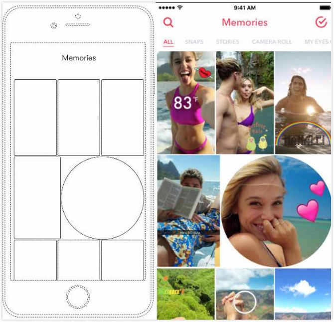 想必很多人都听过“互联网是有记忆的”这句话,微软的相册“回忆”功能印证了这一点,这是对用户过去一段时间所拍照片的一种集中展示,它同样采用了网格的形式。这种用矩形和圆形两种图案展示相册的方式也被微软公司申请了专利,但遗憾的是,微软目前已将这种不规则的展示图案改成了统一的网格。