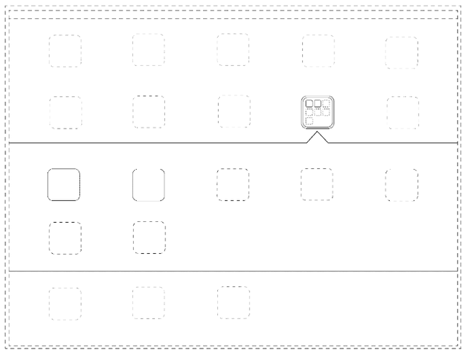 在苹果以前的系统中,点击文件夹时,文件夹中的图标将以横屏的展开状态显示,而所选文件夹上的双重轮廓以及展开下的箭头显示都在这个专利中。虽然苹果目前已经不使用这样的扩展图标,但这项专利仍然属于他们公司。