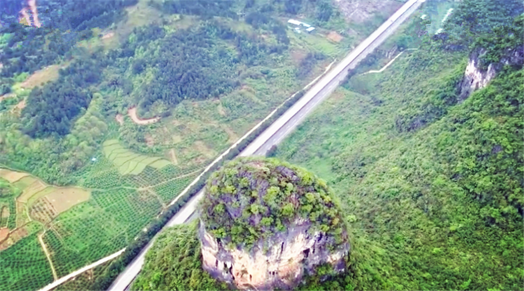 从外观看,这座山峰的地质几乎都是岩质石头,岩石缝里长着翠绿的野树、灌木。石头山伫立在高速公路旁边,四周也是青山,但它比周围的山更高,显得尤其突出。
