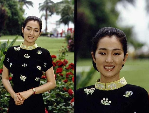 穿上旗袍,很有东方女性的含蓄之感。在那个没有精修与浓妆的年代,虽然脸庞肌肤看起来本不完美,但却是十分的真实与亲切。由于巩俐上镜头显脸大,颧骨大而平,脸型看起来有点偏椭圆。不少人觉得她的脸型虽然不够完美,却有着满满的中国风韵。