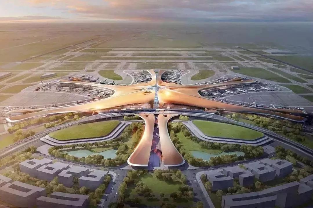 北京大兴机场坐落于永定河北岸,占地面积140万平方米,相当于63个天安门广场,预计今年9月底将正式投入使用。