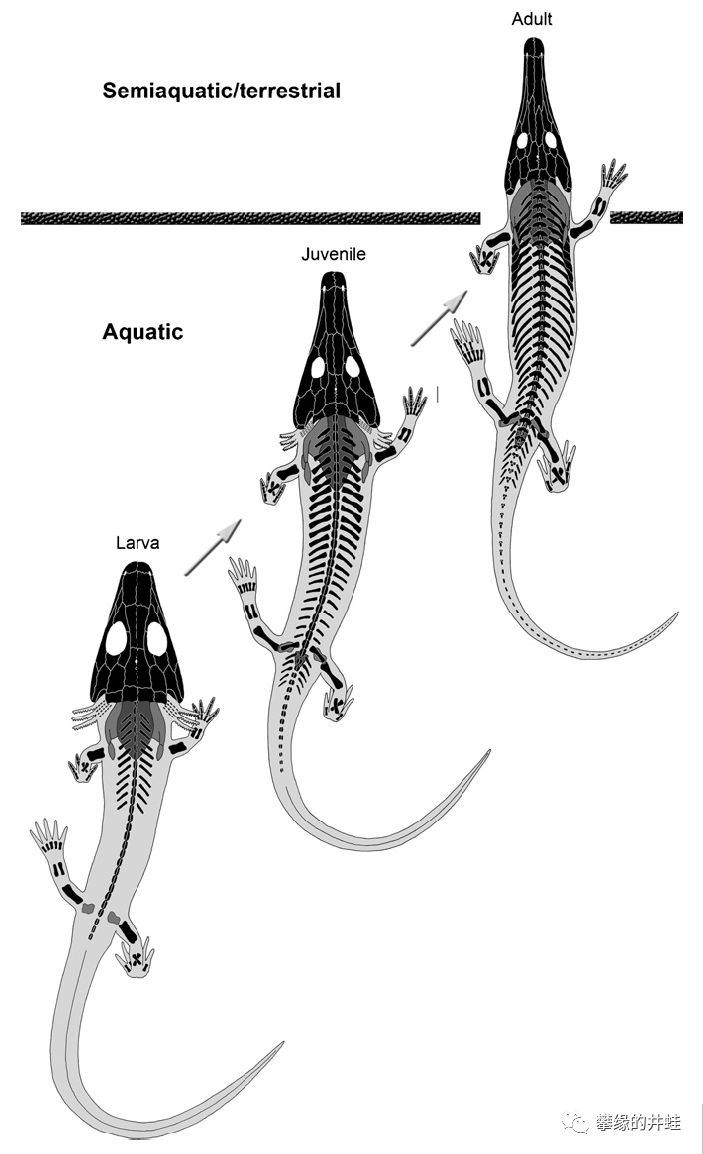 大型离片椎类从幼鲵到成体的发育过程。外鳃萎缩消失,头骨延伸变形,同时伴随的还有脊柱,肋骨和肢骨的钙化成型。图片来源自[12]。