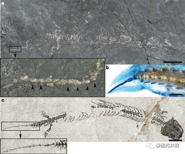 Hyloplesion longicostatum(a)和Microbrachis pelikani(c)完整化石。发现地:捷克;生存年代:石炭纪晚期。它们有多达40块躯干脊柱,像一条被抻长了的蝾螈。图片来自[10],标尺长度:a,c,1毫米;b,2毫米。