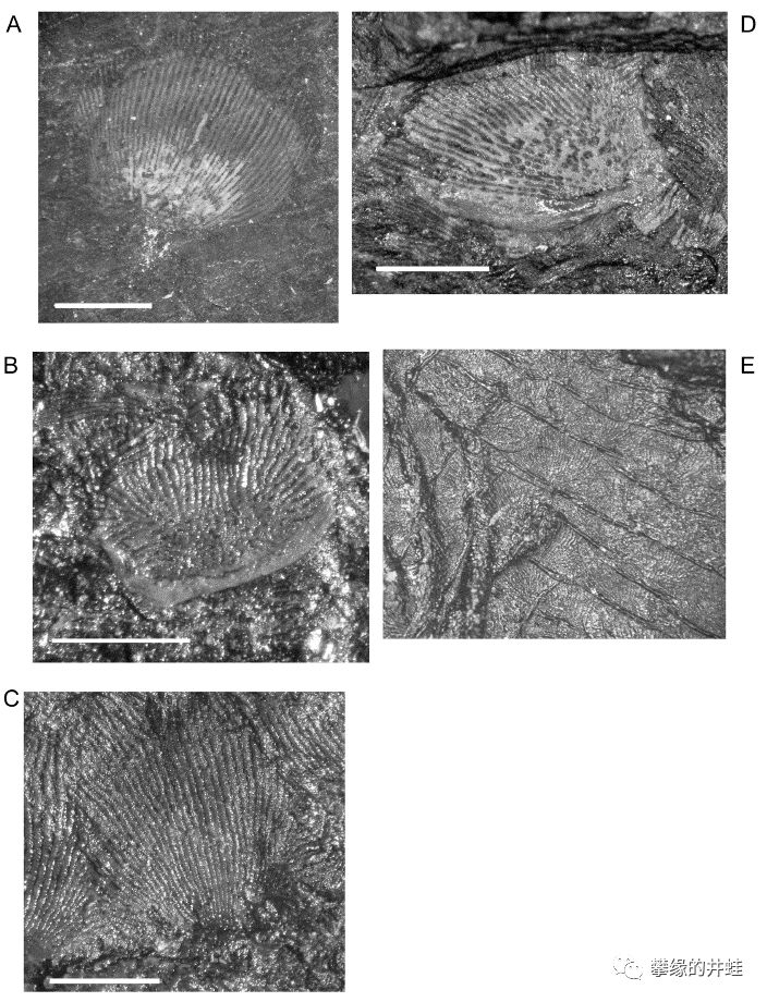 一种石炭纪晚期鳞鲵类:小肢螈Microbrachis pelikani的鳞片化石。A-D是单个鳞片,E是鳞片在皮肤上排列成行。图片来源自[2],标尺长度1毫米。