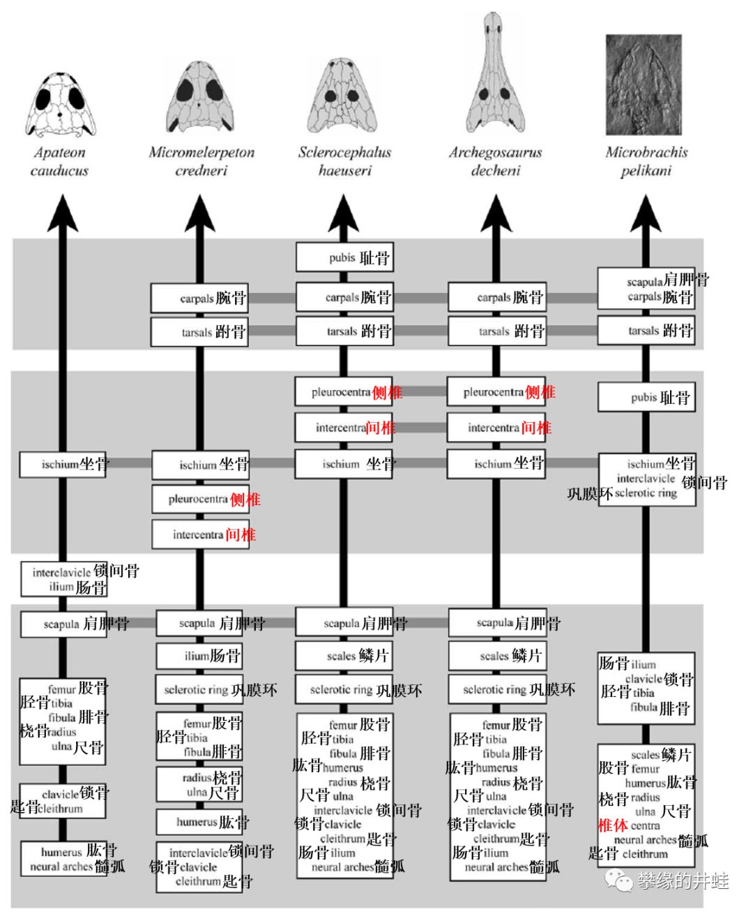 一种小型离片椎类幻螈Apateon的早期发育过程。刚刚孵化的幼体没有四肢,连脊椎都没有骨化,是真正的“蝌蚪”。随后先萌发前肢,然后萌发后肢(这个顺序和现代有尾目一样),摆脱蝌蚪形态,成为亚成体(幼鲵)。图片来源自[11]。