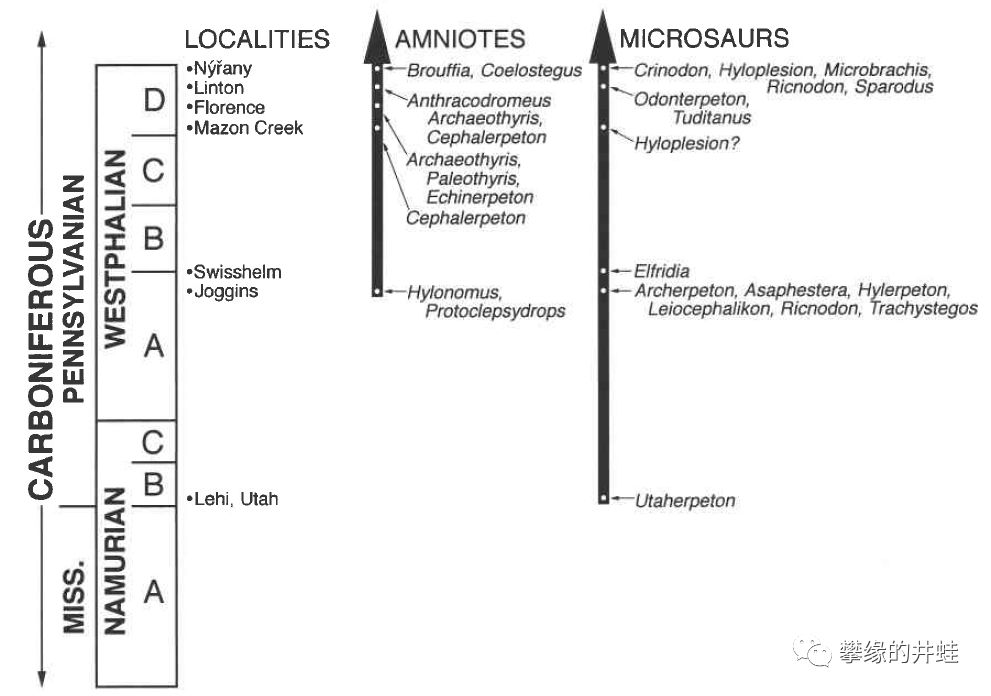 早期羊膜动物(左箭头)和鳞鲵类(右箭头)的生存时间和化石产地,图片来源自[15]。目前发现的最早的鳞鲵Utaherpeton的生存时间要早于林蜥Hylonomus和Protoclepsydrops(可能是最早的合弓纲动物)。“明明是我先的啊!”