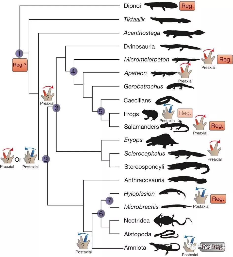 一些灭绝和现存四足动物前肢脚趾的数量对比。注意只有小肢螈科(7)和羊膜类(最下)保留了5根脚趾。这也是壳椎类和羊膜动物亲缘关系的一个证明。蛙的旁边也画了5根脚趾,因为无尾目在蝌蚪阶段末期,前肢肢芽上也是有5根脚趾的,但在变态完成后有一根退化消失了。图片来自[10]。