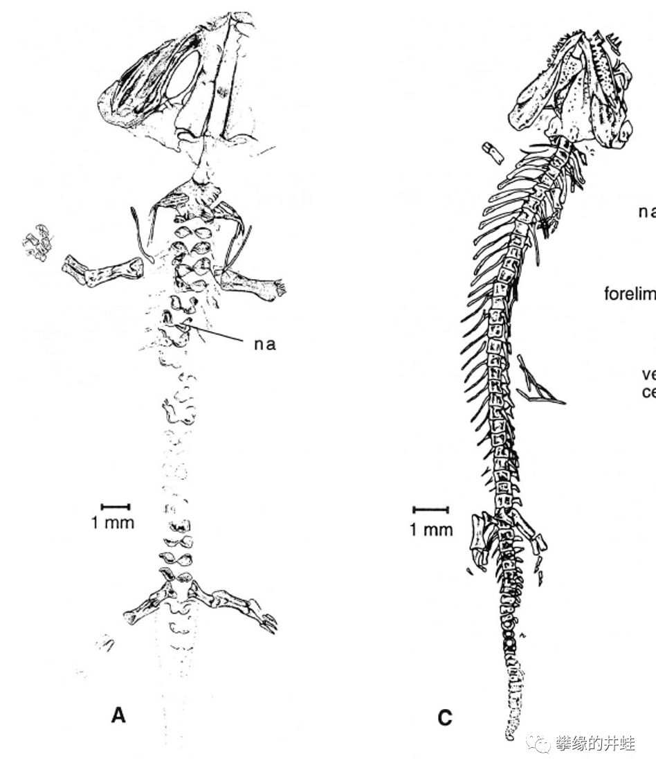 体型接近的小型离片椎类(左:鳃龙科的Branchiosaurus salamandroides)和壳椎类(右:小肢螈科的Hyloplesion longicostatum)幼体骨骼对比。壳椎类幼体的脊柱明显比离片椎类幼体发育完善得多。图片来源自[13]。