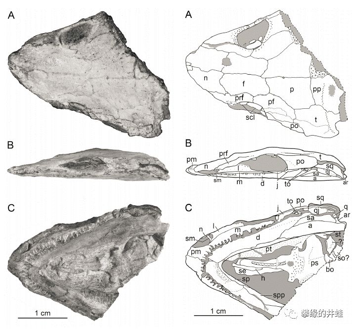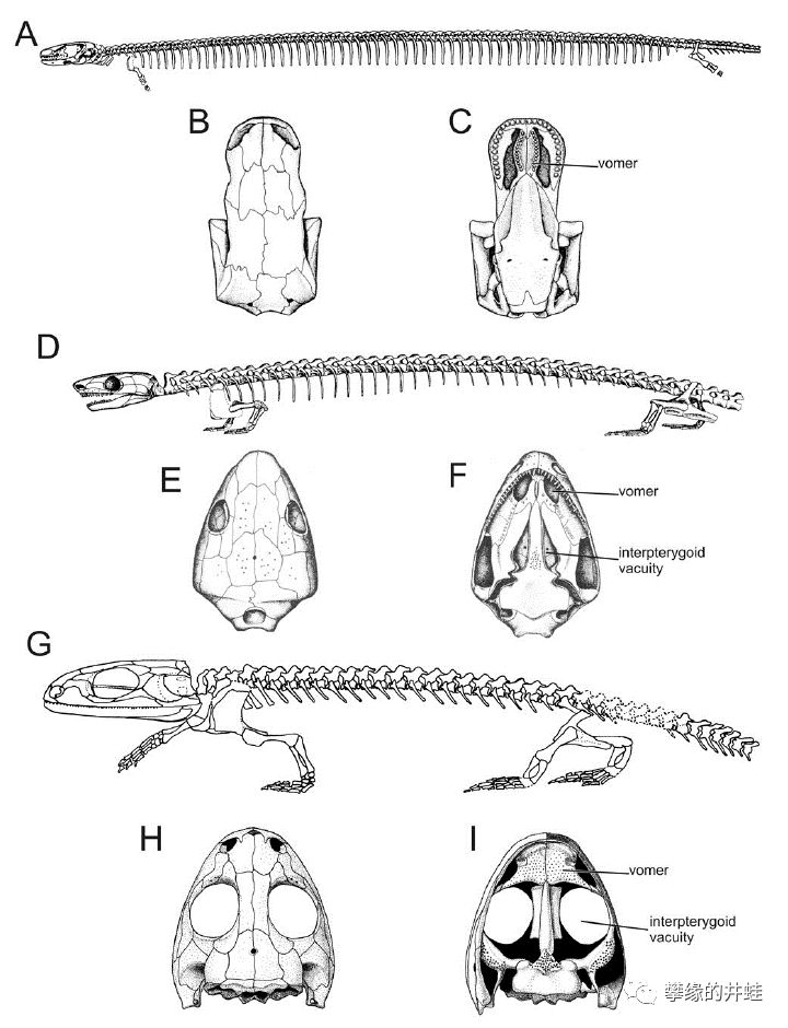 几种曾经被认为和滑体两栖类起源关系密切的古两栖动物。A–C:Brachydectes(弛顶螈类)。D–F:Rhynchonkos(鳞鲵类)。G–I:Doleserpeton(离片椎类—双疏螈类)。在第二百二十九回蟾祖里介绍过,目前的证据显示蛙形类(无尾目和有尾目)起源自双疏螈类的一支,无足目也和鳞鲵类没有关系。图片来源自[4]。
