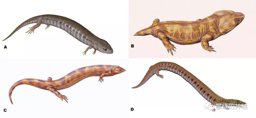 一些鳞鲵类的复原图。A:Hyloplesion;B:Pantylus;C:Pelodosotis;D:Rhynchonkos。抱歉,我找不到它们的中文译名,还请大神们指点。能看出这几个货和蝾螈,蜥蜴有什么不一样吗?图片来源自Wikimedia。