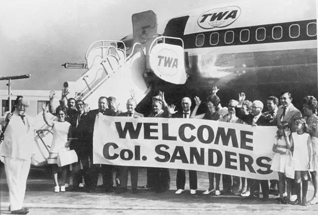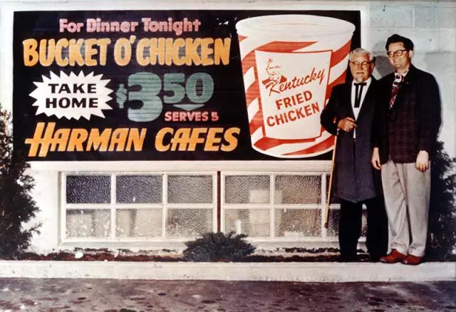 他带着一只压力锅,一个50磅的佐料桶,开着他的老福特,穿着白色西装,打着黑色蝴蝶结,一身南方绅士的打扮,一家家饭店上门推销。