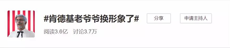 话题#肯德基老爷爷换形象了#阅读量达到3.6亿,讨论高达3.7万。