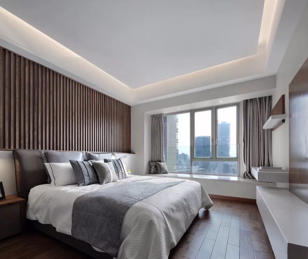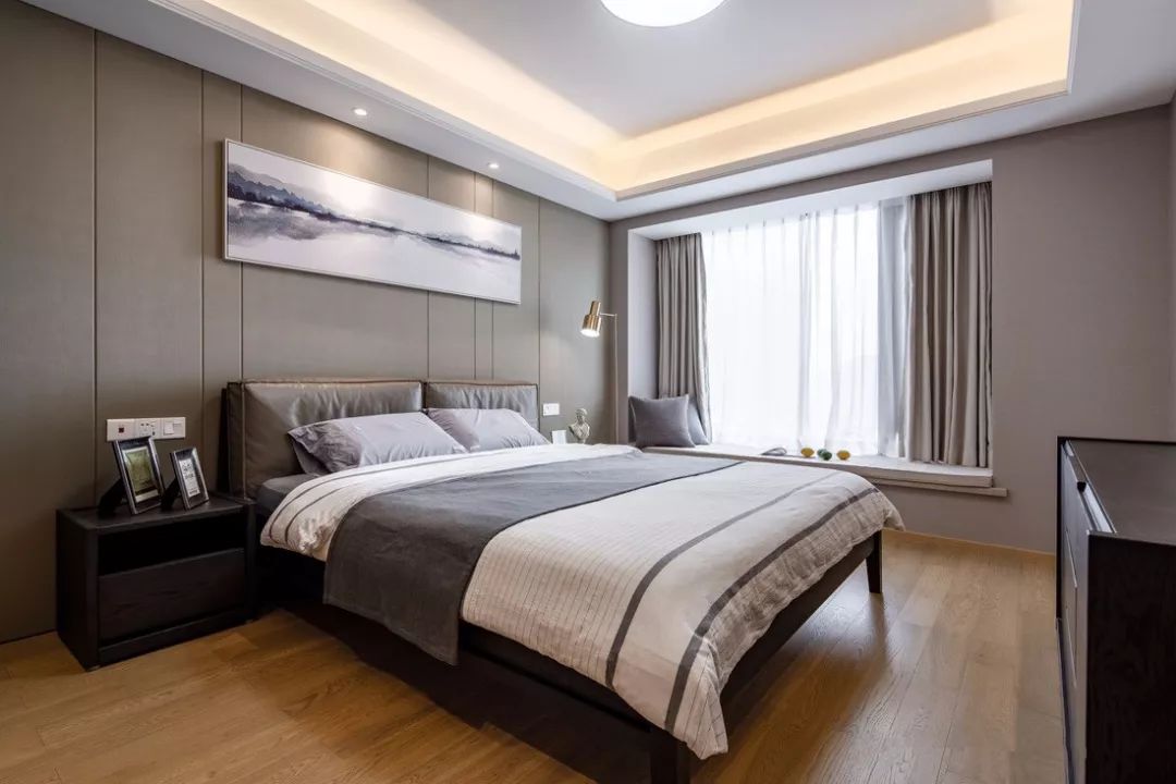 如果窗户的尺寸足够,可以在飘窗上方安装窗帘盒,把窗帘靠窗隐藏安装到窗帘盒里面,整体视觉效果更加简洁美观。
