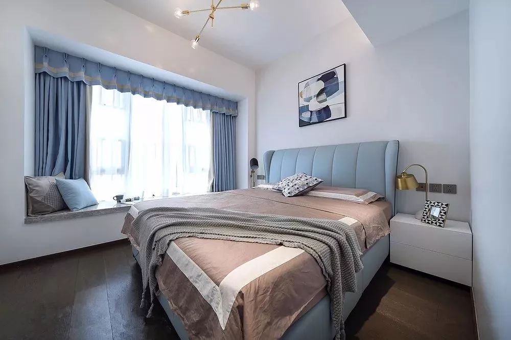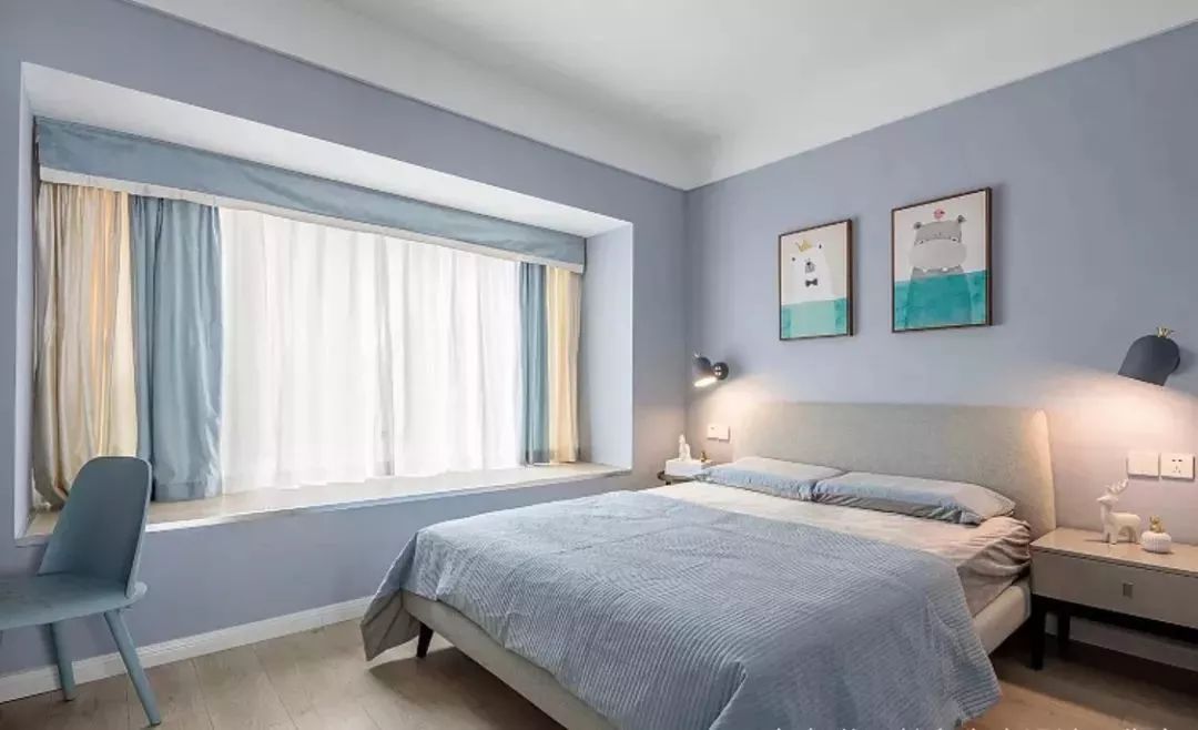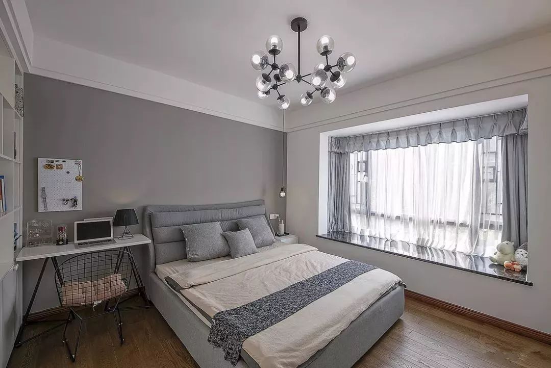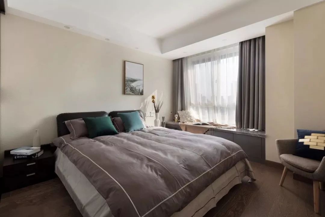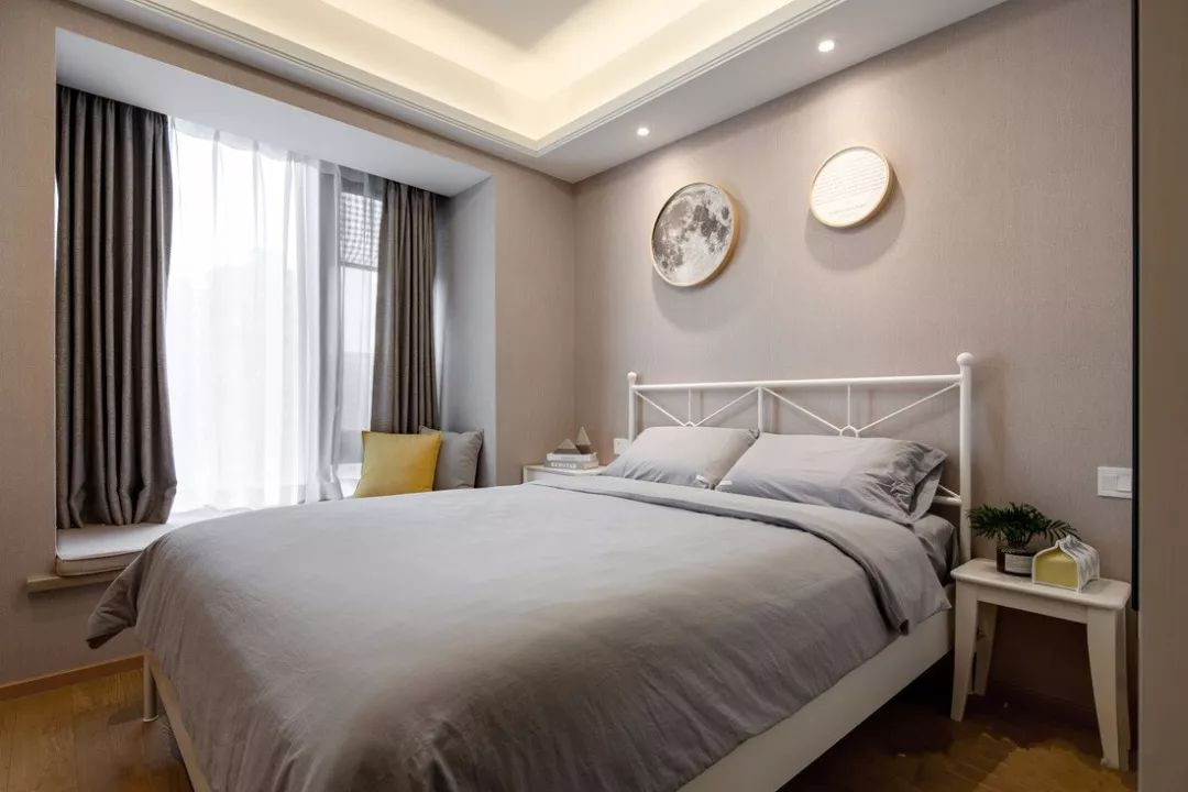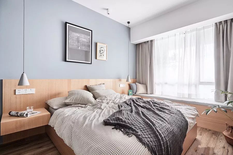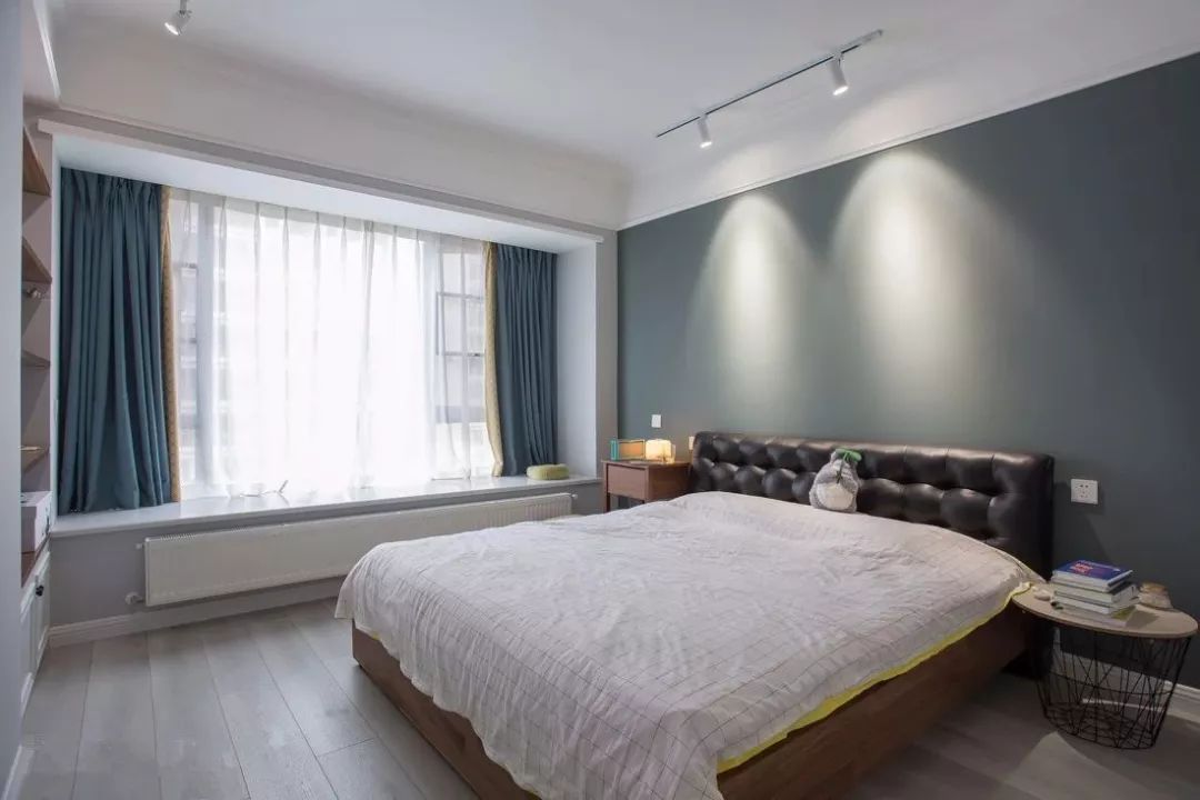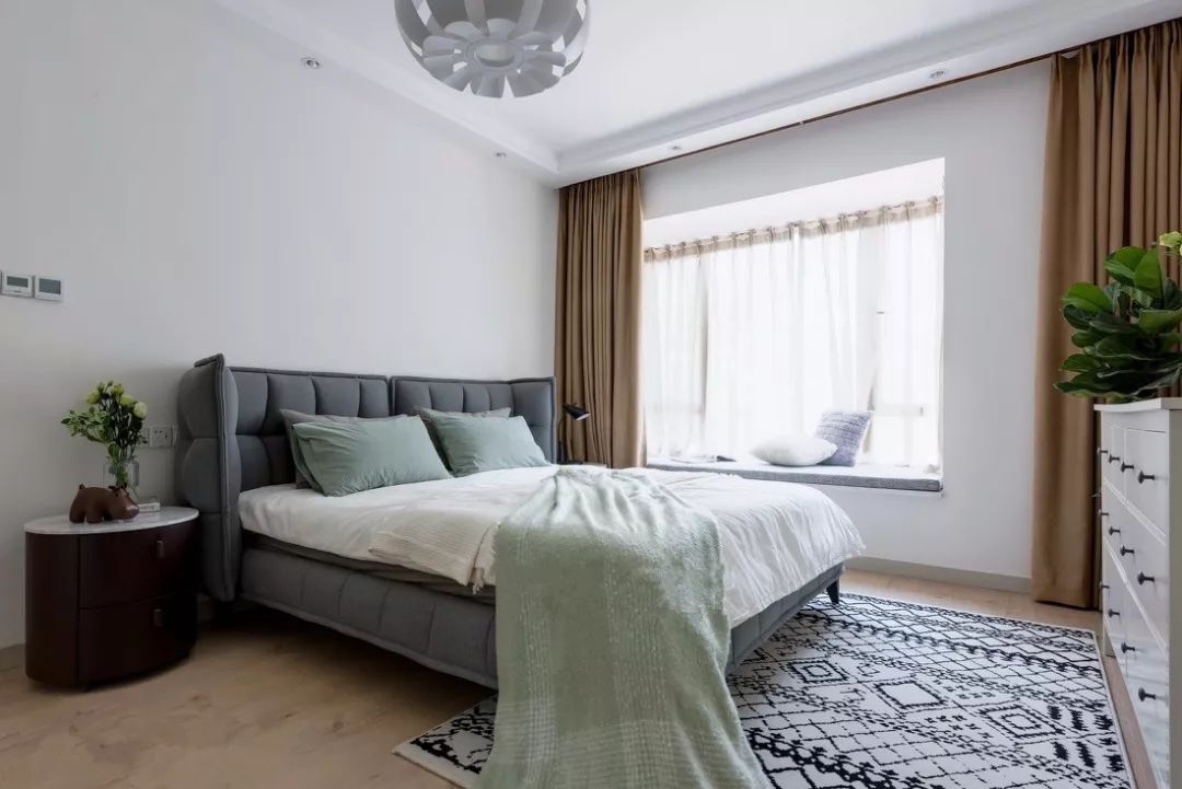 若觉得靠飘窗安装不够方便,也可以把窗帘靠墙安装,这样打开窗帘后整个飘窗就是通透明亮的,而关上窗帘后又能带来一个暗黑舒适的睡眠环境;此外,为了避免飘窗被阳光暴晒,可以把纱帘安装在靠窗位置,这样实用美观两不误。