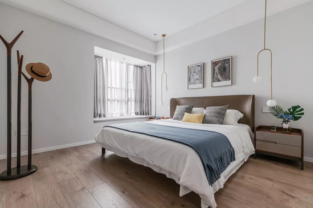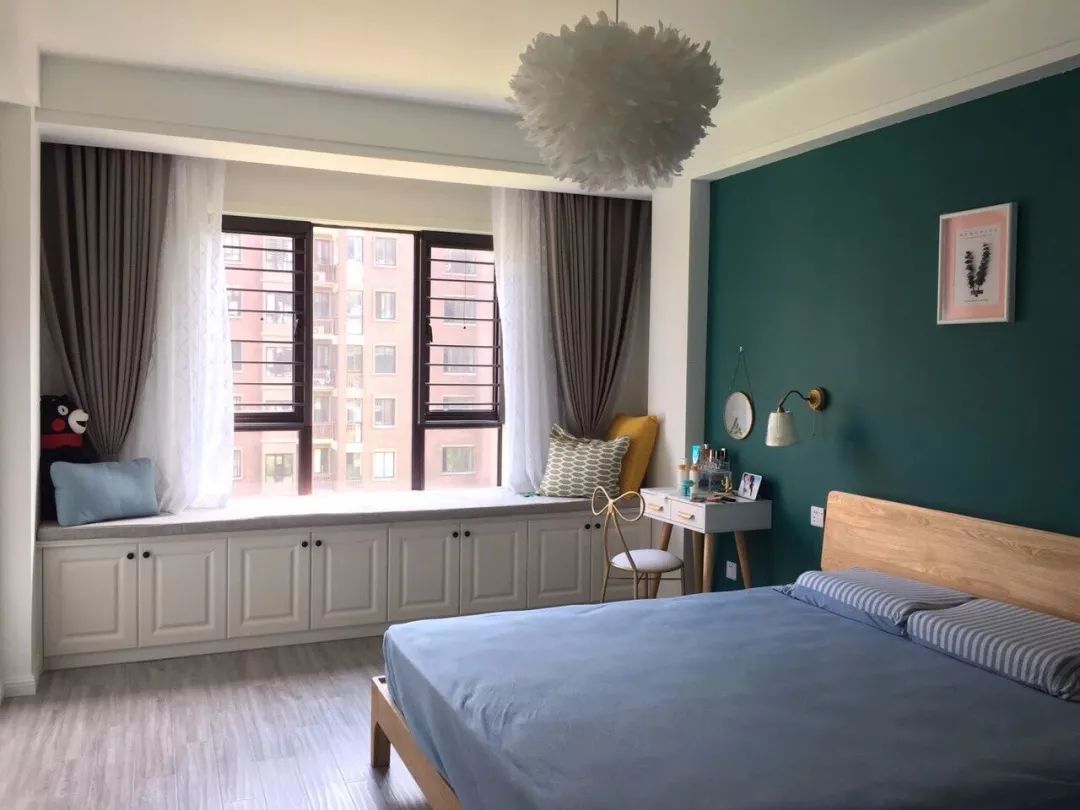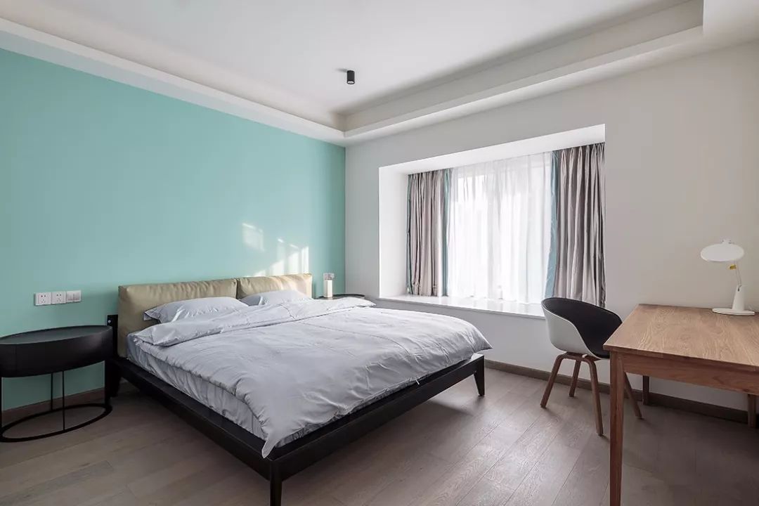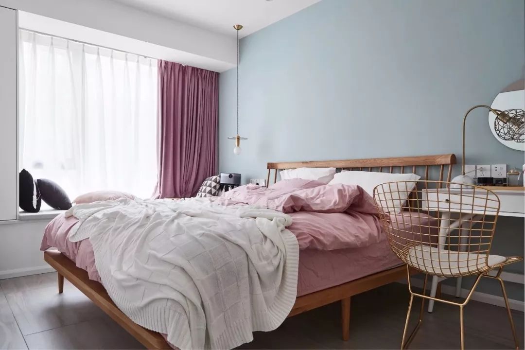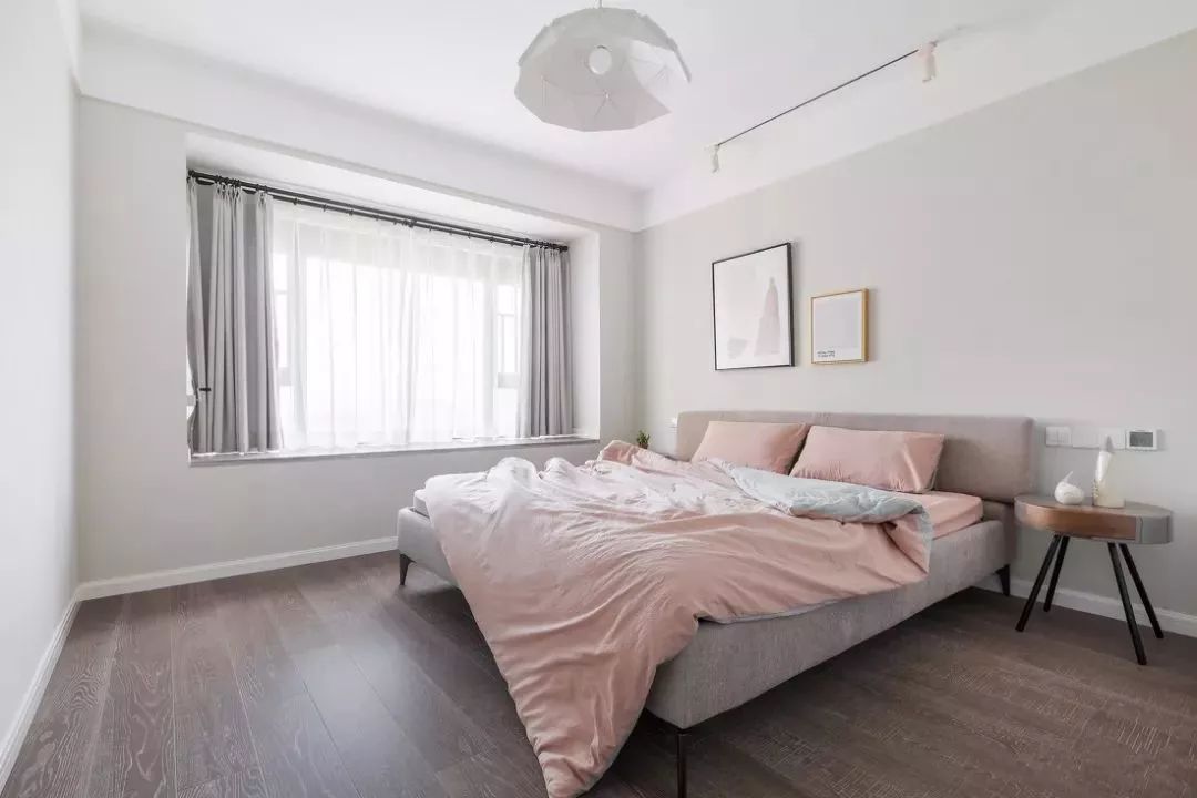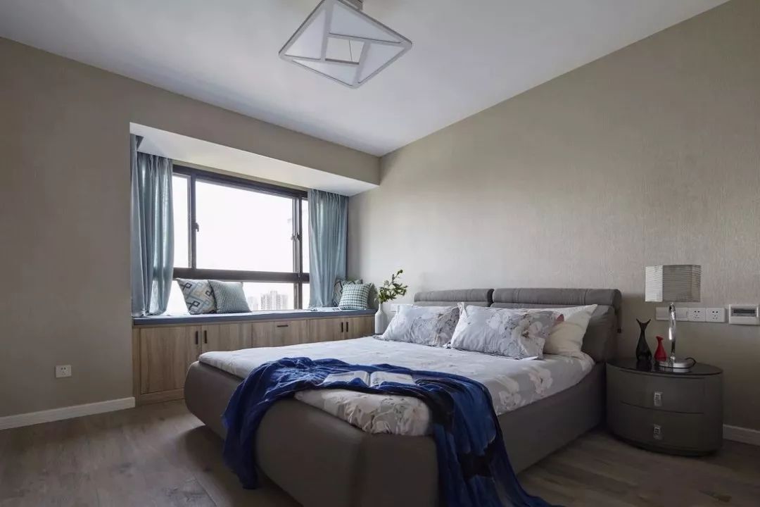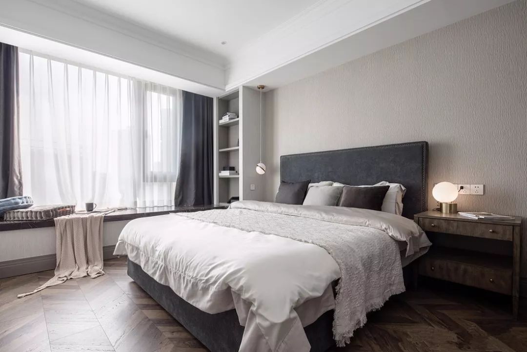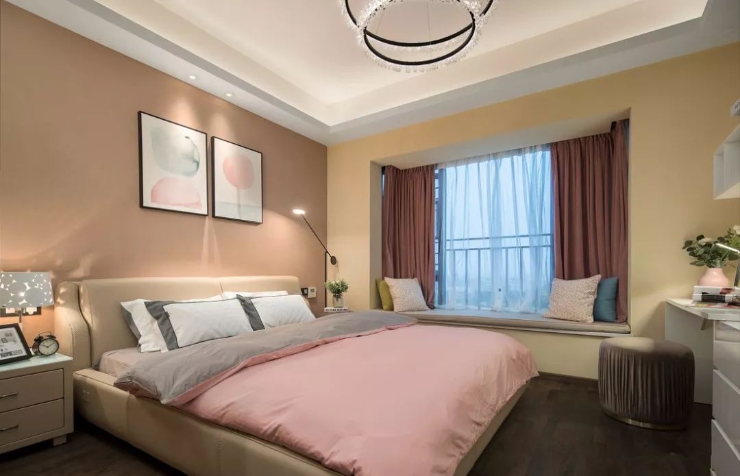 若觉得靠飘窗安装不够方便,也可以把窗帘靠墙安装,这样打开窗帘后整个飘窗就是通透明亮的,而关上窗帘后又能带来一个暗黑舒适的睡眠环境;此外,为了避免飘窗被阳光暴晒,可以把纱帘安装在靠窗位置,这样实用美观两不误。