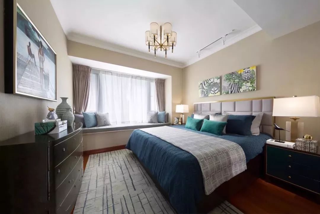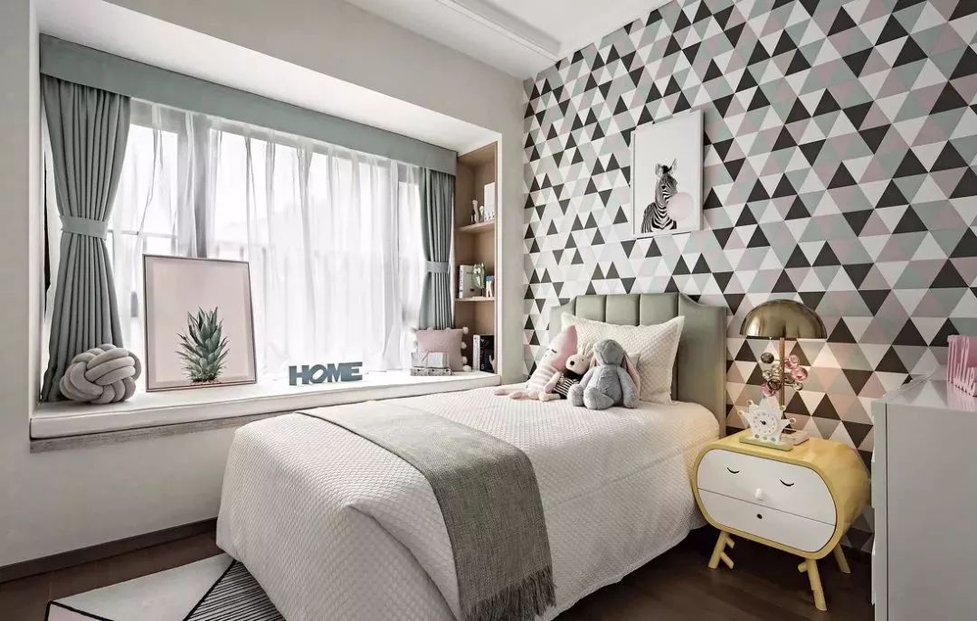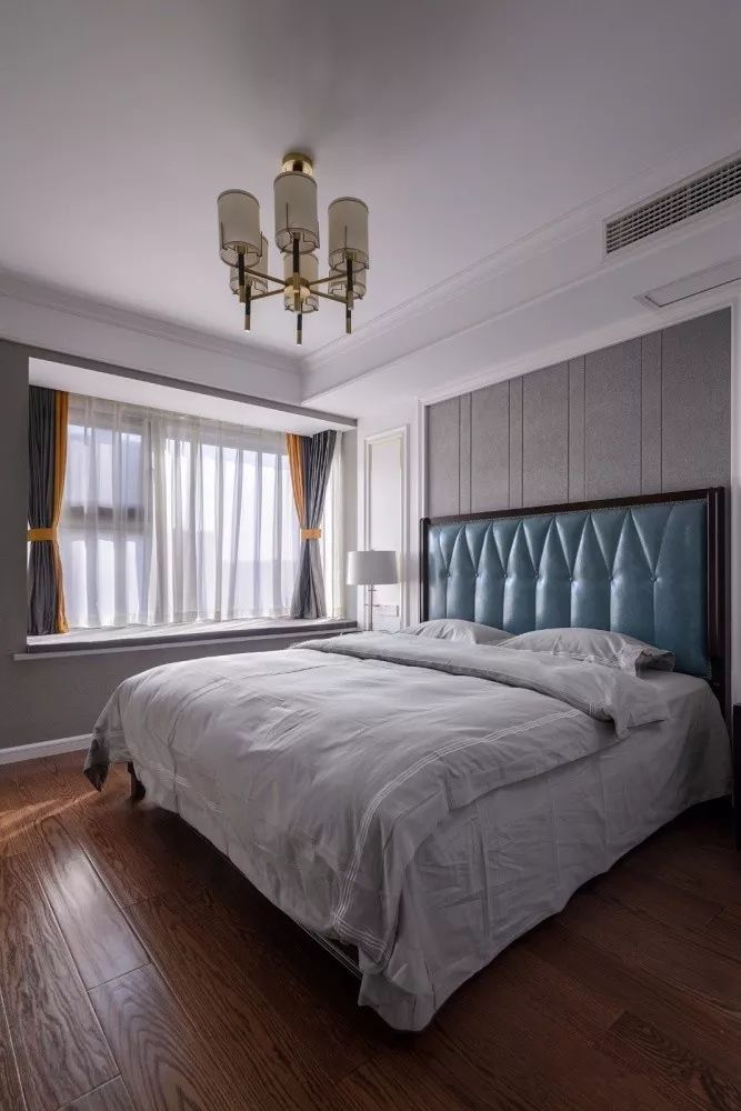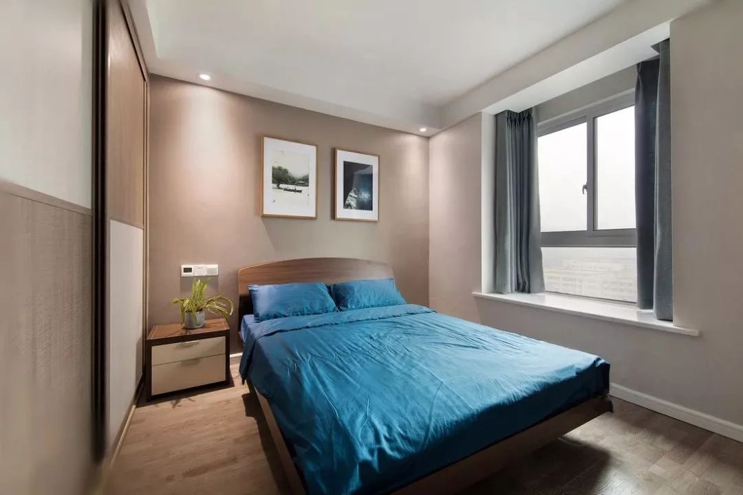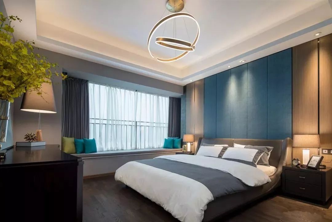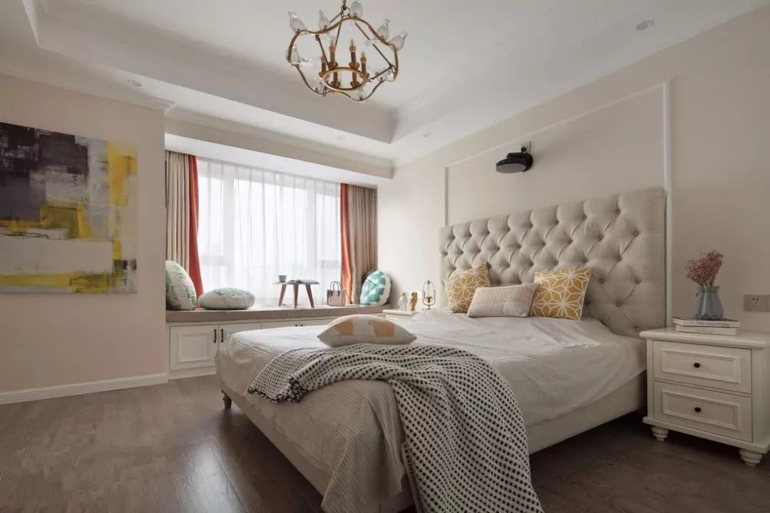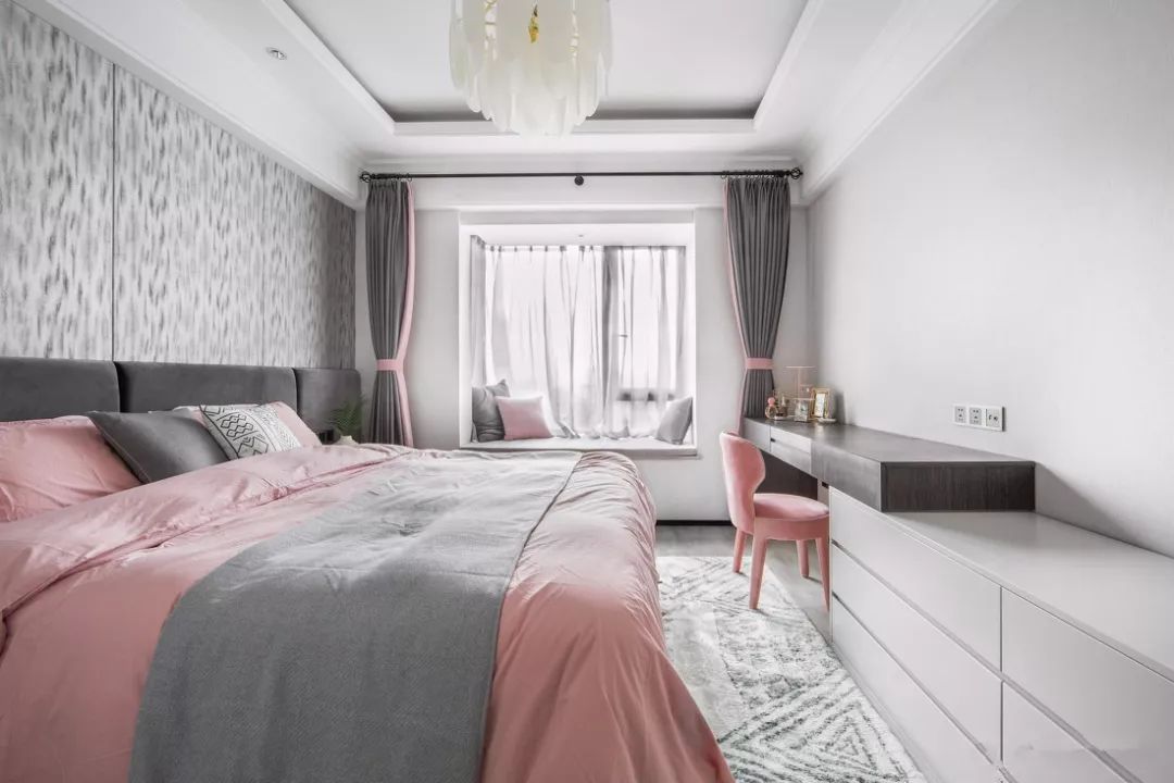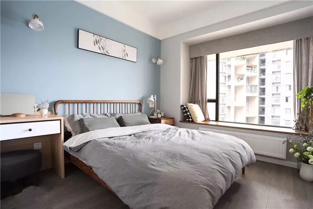若觉得靠飘窗安装不够方便,也可以把窗帘靠墙安装,这样打开窗帘后整个飘窗就是通透明亮的,而关上窗帘后又能带来一个暗黑舒适的睡眠环境;此外,为了避免飘窗被阳光暴晒,可以把纱帘安装在靠窗位置,这样实用美观两不误。