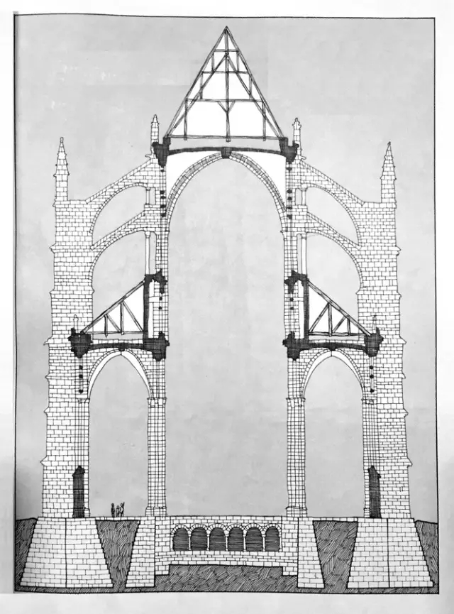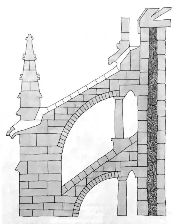 曲线优美的飞扶壁如何而来?首先,木匠会在地面制作临时的木结构,它被称为“鹰架”(centering),承受石墙的力量并保持拱的形状,直至石头间的砂浆凝固。永久性的石头飞扶壁造好后再将其拆除。