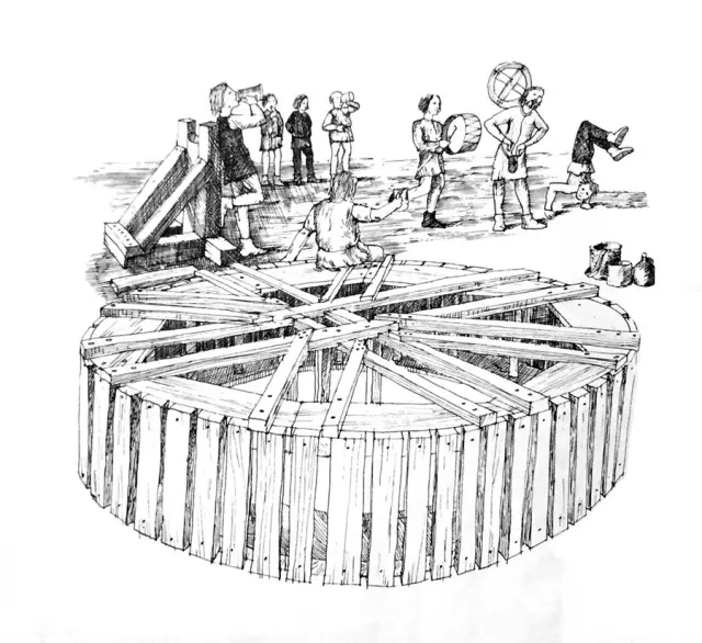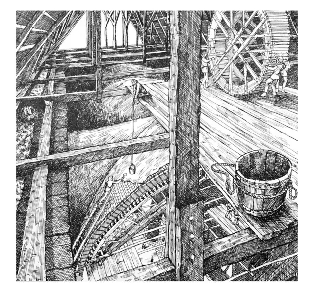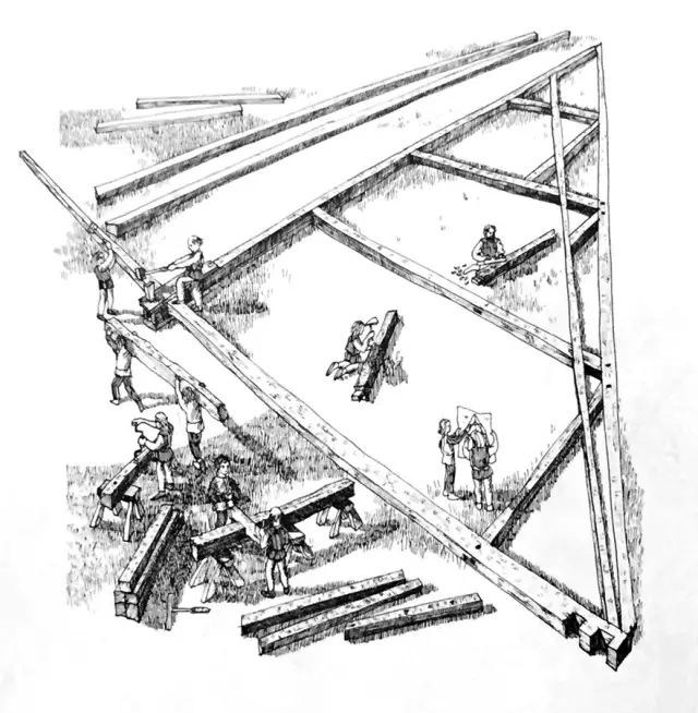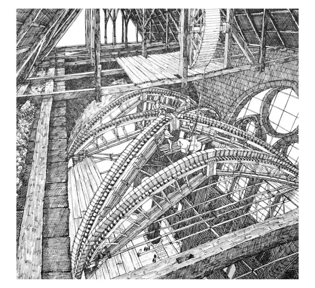 木质屋架同样在地面组装,采用榫卯结构,检测牢固后再把它们拆掉,运送到屋顶高度重新组装。吊车则是通过滑轮装置运送材料的。