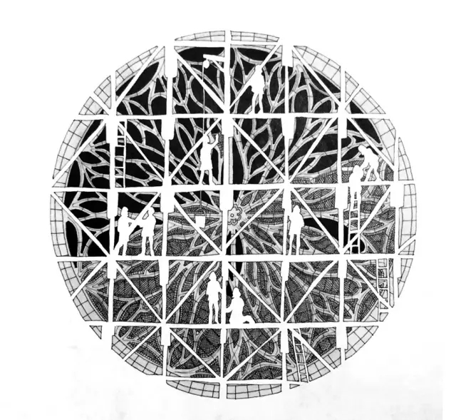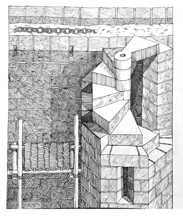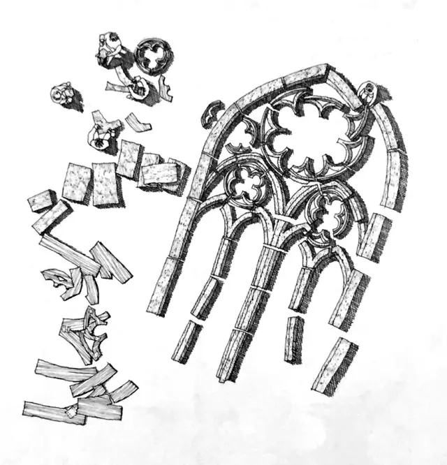 每一个花窗,则是几百块石质构件拼成的,相互之间用铁件固定(请注意图左上的那几个人影,有了他们,你才能明白作者是在画鸟瞰图,也才知道这个窗有多大)。
