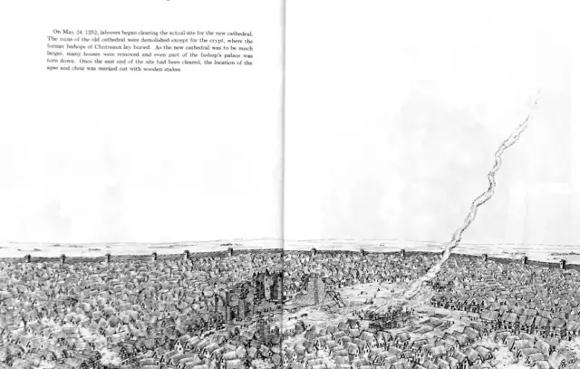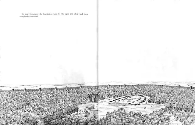 老教堂已经被清理干净了,除了埋着老主教的地下室全都拆掉,工人在基地上画出歌坛(choir)和后殿(半圆室)的位置,然后开始挖坑。基础的墙非常厚的墙,又要依着老地穴的位置,足有25英尺(7.6米)深。