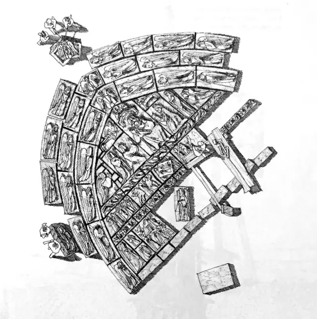 人们还要制作西立面山墙的雕刻,石块在地面上被一一摆好,三个入口上方各有一个接近半圆形的浮雕。