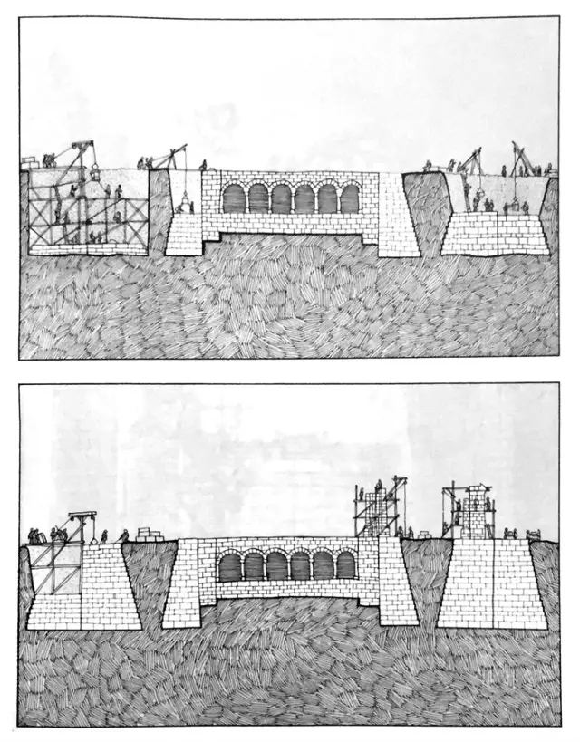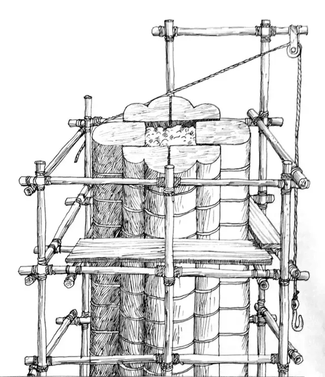 随着墙的增高,脚手架也开始出现。脚手架上设有供石匠停留的平台,由于木材昂贵,拱廊上部的脚手架其实是不落地的,而是悬挂在墙上,并随着建造不断向上移,由于楼梯也在不断往上长,倒是不愁下不去。