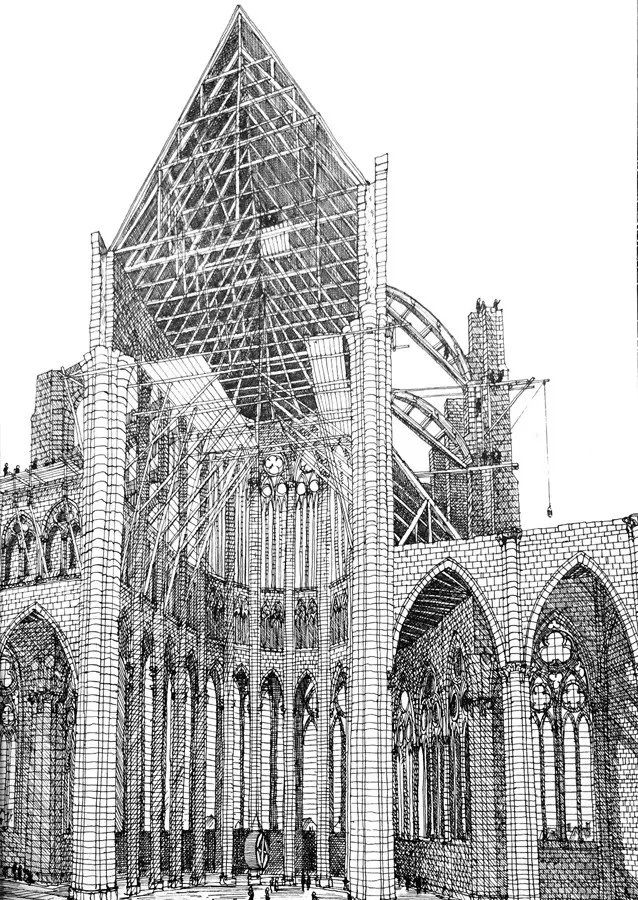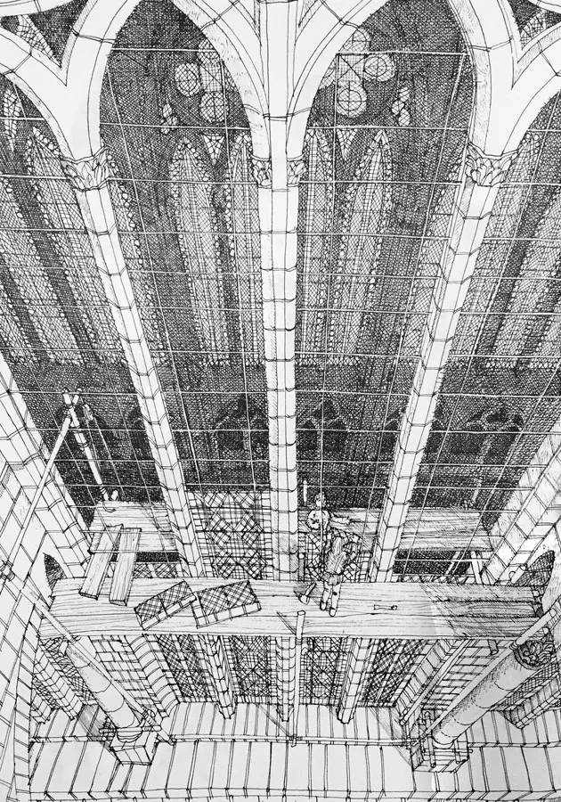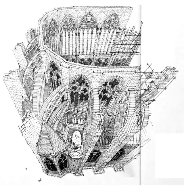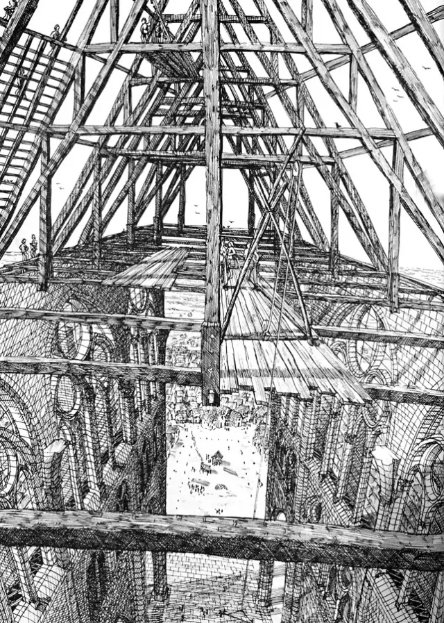 拱顶同样用到了前面提到的“鹰架”,和飞扶壁处的作用差不多,位于两堵墙之间,130英尺的高空,它们会支撑石质的拱肋,直到石块之间的砂浆凝固,可以承受自身的受力为止。一个柱跨内四个柱墩的拱顶要同时建造。与此同时,外侧的飞扶壁已然完工。