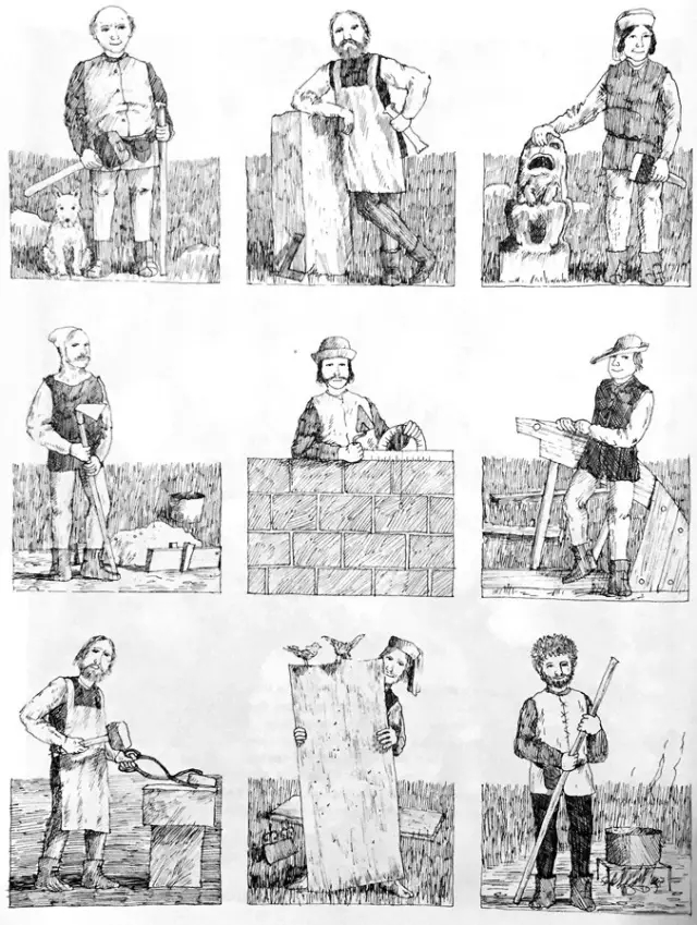 接下来就是众多大师(master)的登场(从左到右,从上到下依次是):采石大师、切石大师、雕石大师、灰泥制作大师、泥瓦匠大师、木匠大师、铁匠大师,屋顶工大师和玻璃大师……