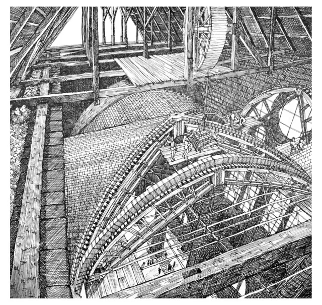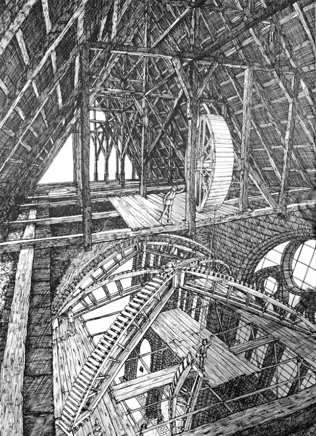 为了建造拱顶,他们先做了个奇怪的大家伙——可以容纳两个人在里面走动的大圆盘,用吊装木屋架的绞盘运送到顶部,系上绳子,然后由人在里面走动驱动圆盘转动,可以提升非常重的材料——这大概是早期吊车的雏形了。