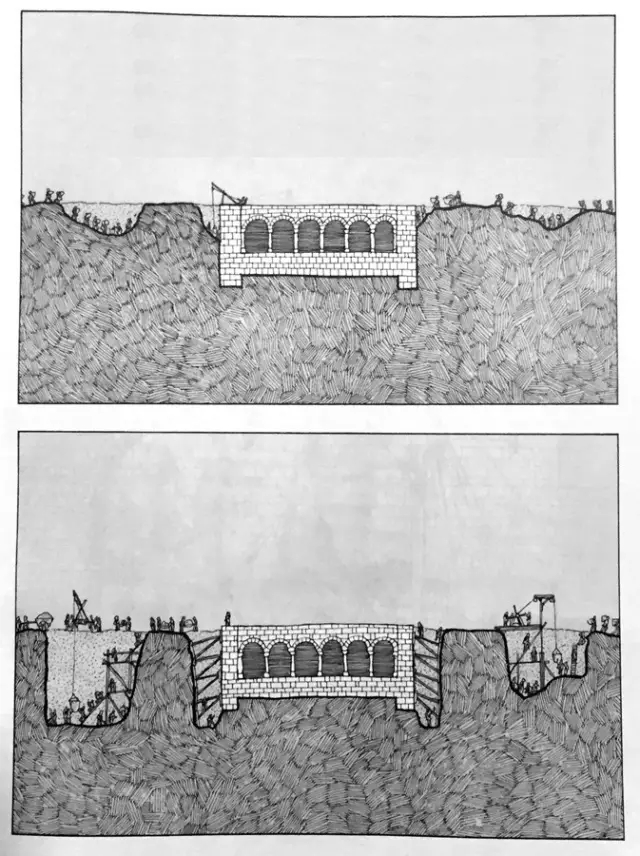 随后,由木匠和石匠组成的工作小组同时展开工作。首先是木匠,在两个鹰架之间铺上木板垫层,石匠再在上面铺上石顶,这层石头要找尽可能轻质的,以减少拱肋的受力。同样的,到砂浆干透后,就可以拆掉木板了。