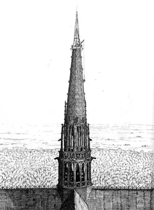1331年,屋顶上的尖塔也造好了,它位于十字形平面交叉点的正上方。这是一个木质包着铅皮的结构,雕刻精美,装饰繁复。